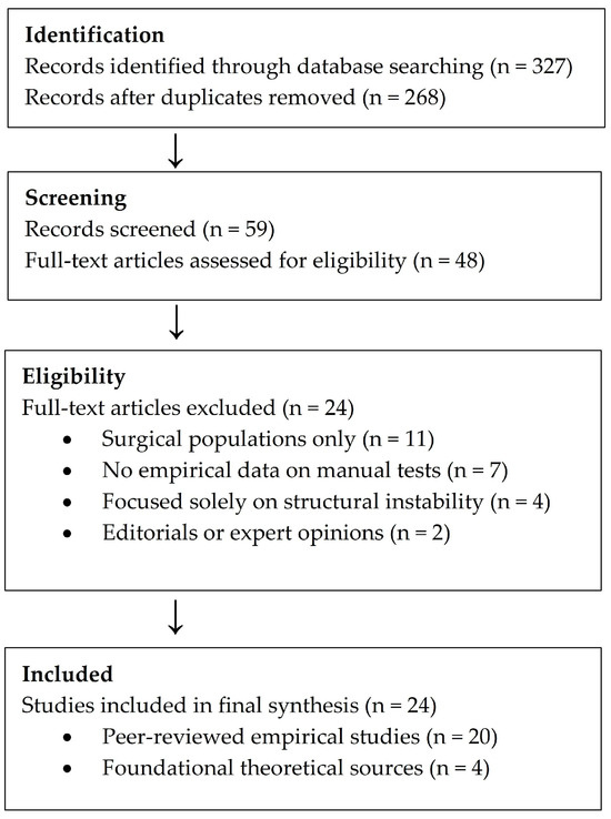 A structured database search yielded 327 records. After removal of duplicates and initial screening, 48 full-text articles were assessed for eligibility. Exclusion criteria included studies focused exclusively on surgical populations, lacking empirical data on manual test performance, or addressing structural instability without reference to motor control dysfunction. Editorials, conference abstracts, and expert opinions lacking methodological transparency were excluded.