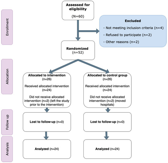 In total, 60 patients with psychotic disorders were assessed for eligibility. Of these, four did not meet the inclusion criteria, two declined participation, and two were excluded for other reasons. Consequently, 52 patients were randomly assigned to the two study groups. After the 12-month period, 24 participants in each group remained and were included in the final analysis. No adverse events or dropouts were reported. The CONSORT diagram of the study is detailed in Figure 1 and participant characteristics are presented in Table 1. No differences were recorded between groups at baseline.