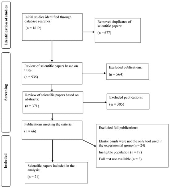 A database search yielded 1612 articles. After removing 677 duplicates, the remaining 935 articles were screened by title and abstract, which led to the exclusion of 869 publications. A total of 66 articles underwent full-text assessment, and 45 were excluded for not meeting the inclusion criteria. This resulted in a final count of 21 studies included in the analysis. The full process is shown in the flow diagram (Figure 1).