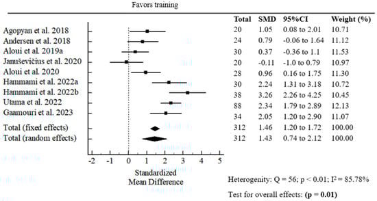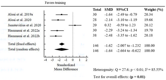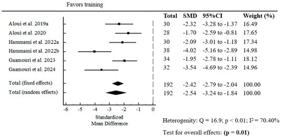 The meta-analysis of the effect of resistance band strength training on COD performance revealed a statistically significant pooled standardized mean difference (SMD = −2.54; p = 0.01) (Figure 5).