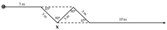Participants took part in a single pre-intervention and a single post-intervention testing session, during which thigh and shank kinematics, as well as hamstrings and quadriceps muscle activity, were recorded. Prior to each session, they completed a standardized 10 min warm-up consisting of mobility exercises and variable-intensity running with COD drills [12]. Each participant then completed six trials of the Change of Direction and Acceleration Test (CODAT), three using the DL and three using the non-dominant limb (NDL), all performed at maximum effort, with 45 s of recovery between trials [35]. The CODAT was selected based on prior research indicating that 90° directional changes impose a greater demanding challenge for the players, providing a more effective assessment of knee stability [43,44]. This test combines sprinting with stabilization and acceleration demands, incorporating four COD, two at 45° and two at 90°, interspersed with 3 m sprints and a final 10 m sprint. The second 90° COD was selected for data analysis, following previous recommendations (see Figure 1) [43]. Participants completed a familiarization period to minimize learning bias. Each participant was assigned a unique anonymized code to reduce potential analysis bias, thereby ensuring the reliability and objectivity of the data collected during the pre- and post-intervention testing sessions [43].