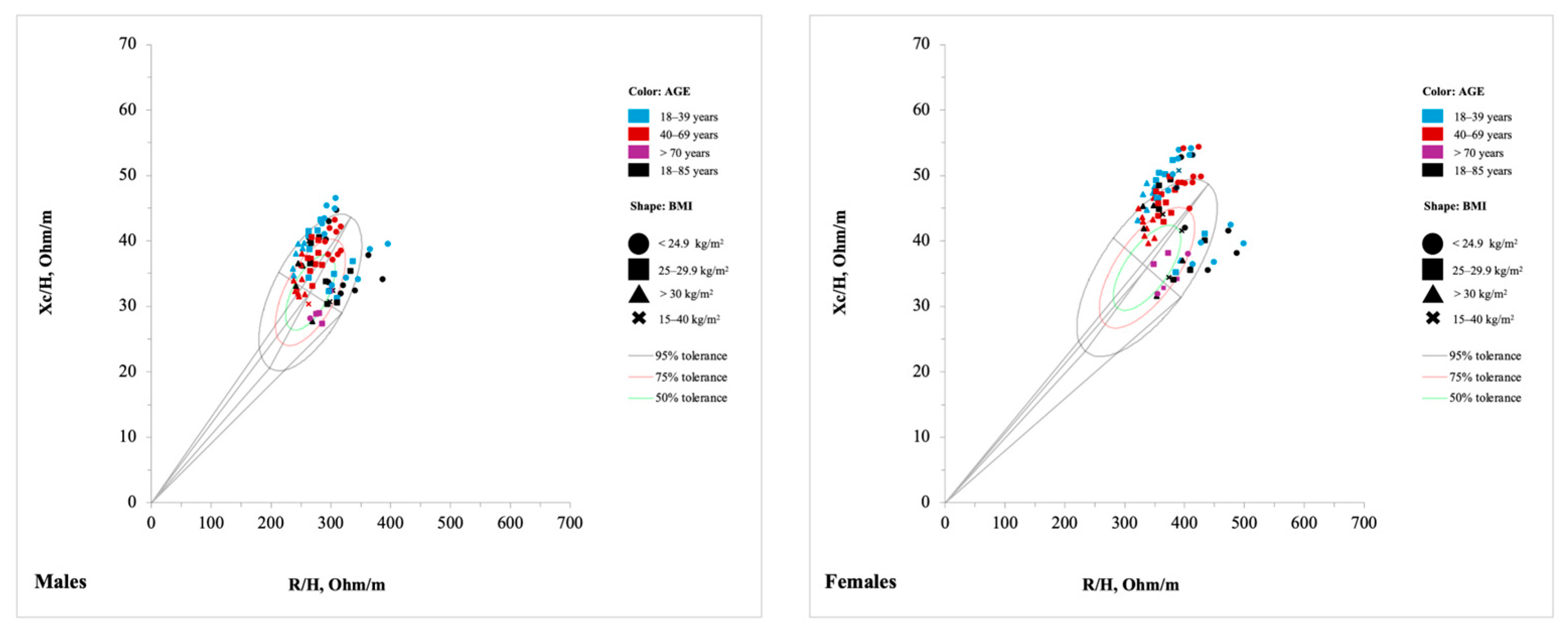- Piccoli, A.; Pillon, L.; Dumler, F. Impedance Vector Distribution by Sex, Race, Body Mass Index, and Age in the United States: Standard Reference Intervals as Bivariate Z Scores. Nutrition 2002, 18, 153–167. [Google Scholar] [CrossRef] [PubMed]