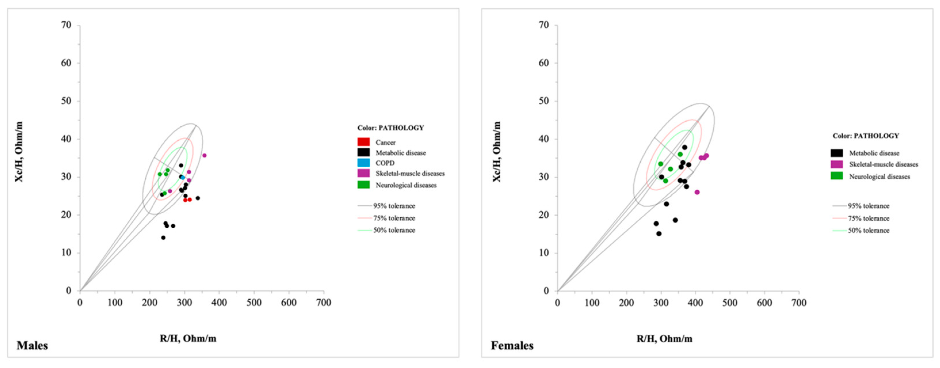 - Bogonez, P.; Rabinovich, R.; Nescolardel, L.; Roca, J.; Roselll, I.; Riu, P.; Piccoli, A. Bioelectrical Impedance Vector Analysis in COPD Patients. In Proceedings of the 25th Annual International Conference of the IEEE Engineering in Medicine and Biology Society, Cancun, Mexico, 17–21 September 2003. [Google Scholar]