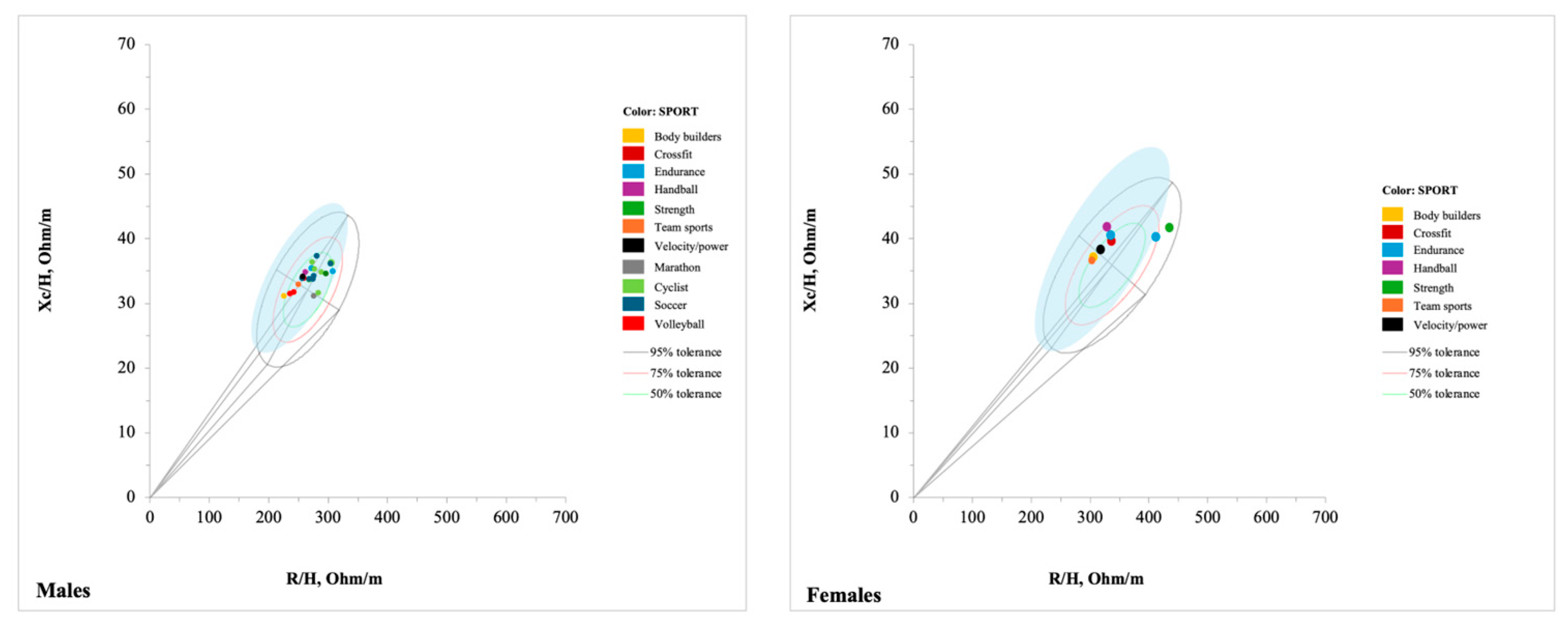 - Campa, F.; Matias, C.; Gatterer, H.; Toselli, S.; Koury, J.C.; Andreoli, A.; Melchiorri, G.; Sardinha, L.B.; Silva, A.M. Classic Bioelectrical Impedance Vector Reference Values for Assessing Body Composition in Male and Female Athletes. Int. J. Environ. Res. Public Health 2019, 16, 5066. [Google Scholar] [CrossRef] [PubMed]