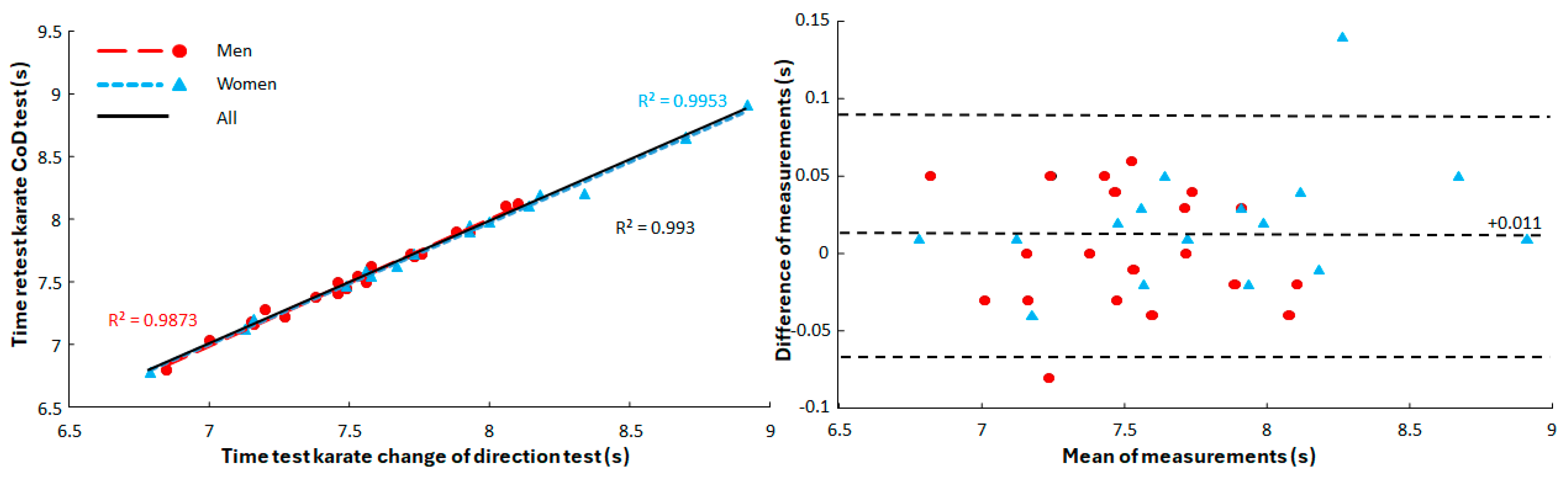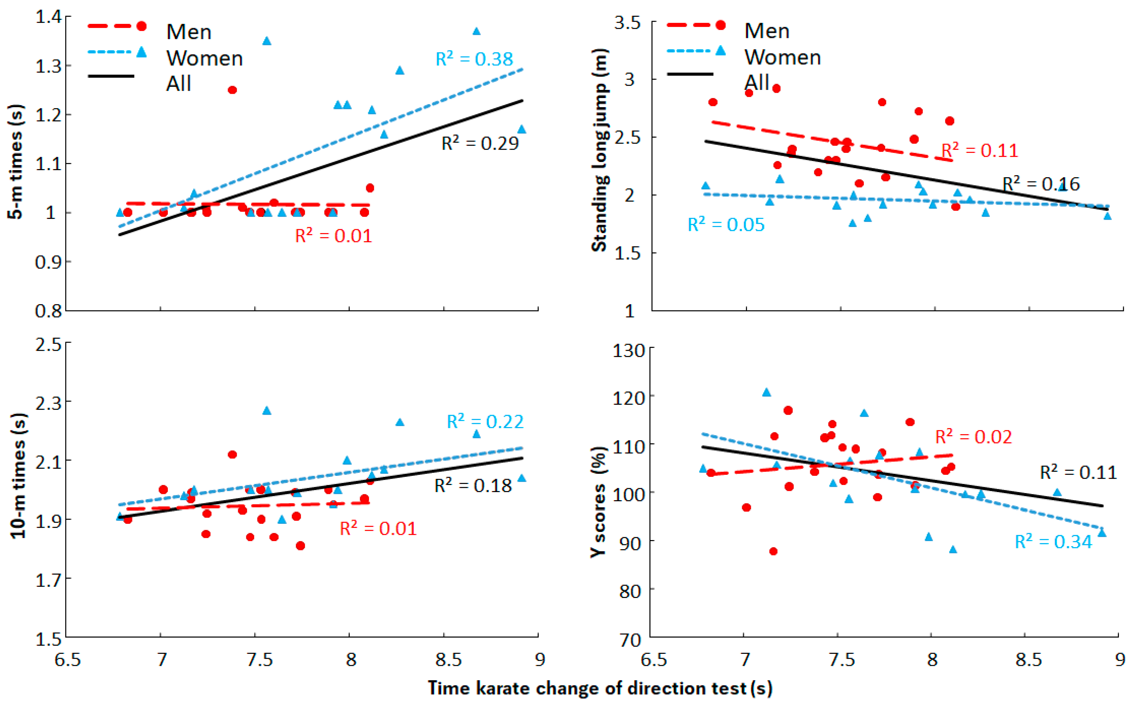 23]. To assess associations between the karate CoD test with the other motor abilities for men and women linear regressions (Pearson’s correlations) were compared. To assess sex effect, the regression lines on the two sex groups were compared with the regression on the pooled data of males and females using an F-test as described by Crowder and Hand [