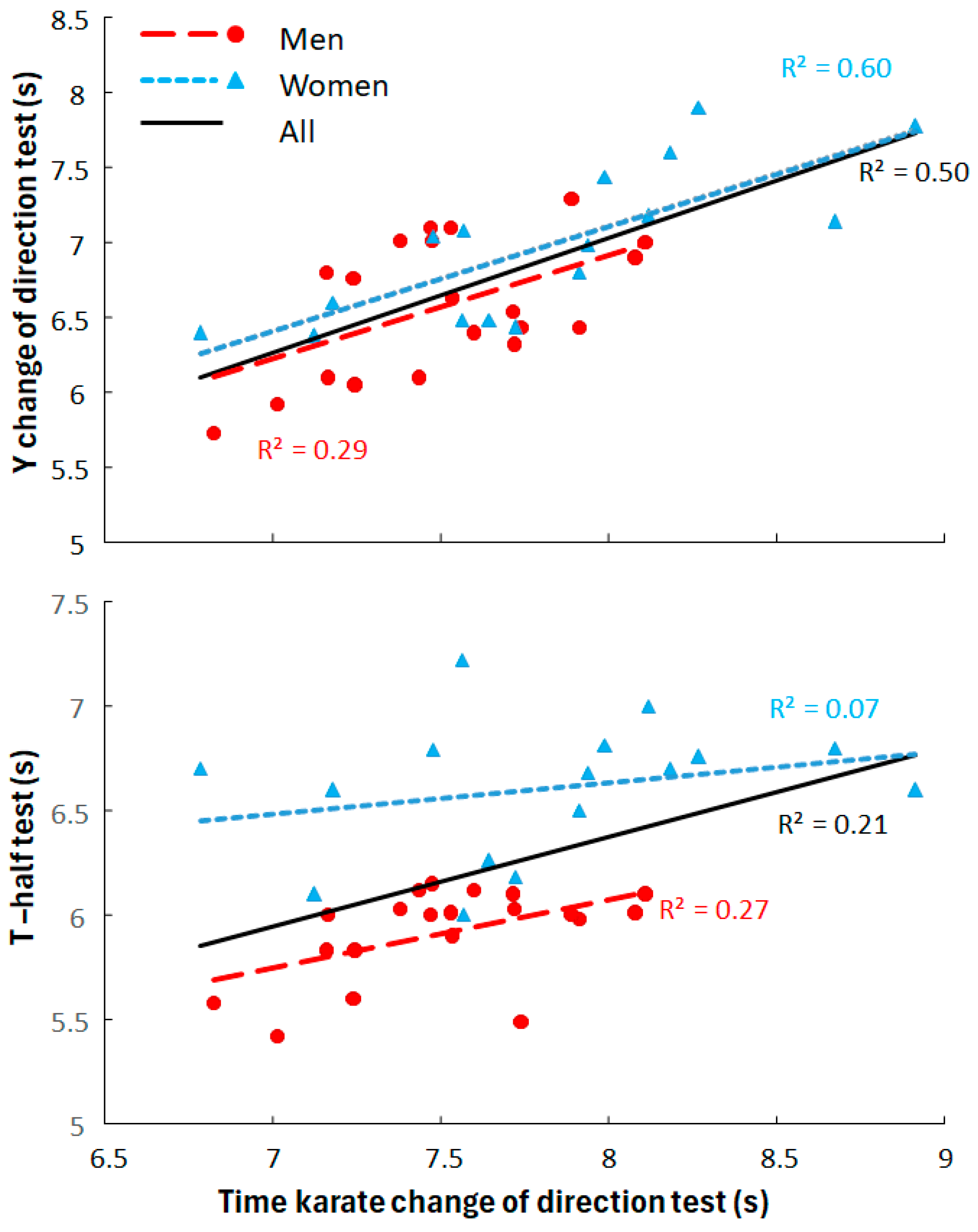 The pooled regression analysis revealed stronger associations between the karate CoD test and other performance measures compared with sex-specific analyses, likely reflecting increased variance when combining males and females [
