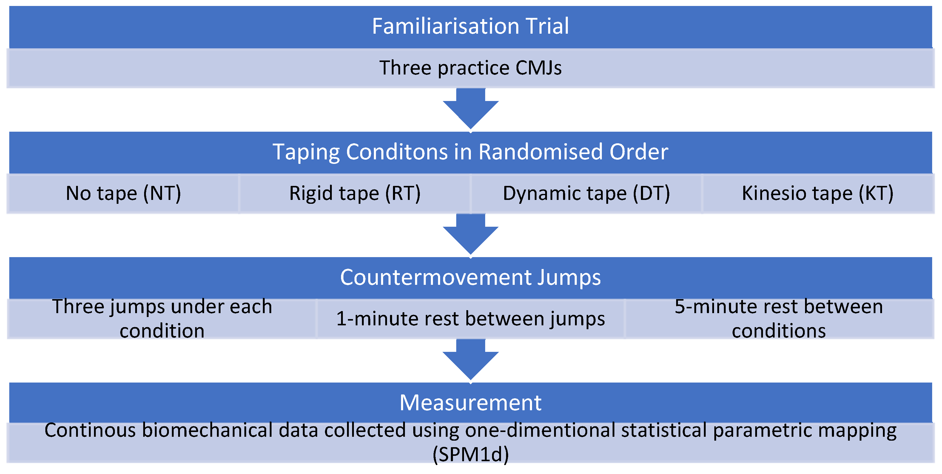 The CMJ consists of sequential unweighting, braking, and propulsive phases before take-off [8,9,10]. Traditional analyses have focused on discrete variables, such as peak ground reaction force (GRF) or maximum velocity [3,4]. While these measures are informative, they capture only isolated time points and may overlook adaptations that emerge across the entire movement cycle. Statistical parametric mapping (SPM) offers a solution by enabling the continuous analysis of normalised force and kinematic time, providing greater sensitivity to subtle alterations in joint motion and force application that discrete approaches may miss [11,12,13]. This approach is particularly valuable when evaluating interventions that may affect coordination across phases of movement, such as joint taping.