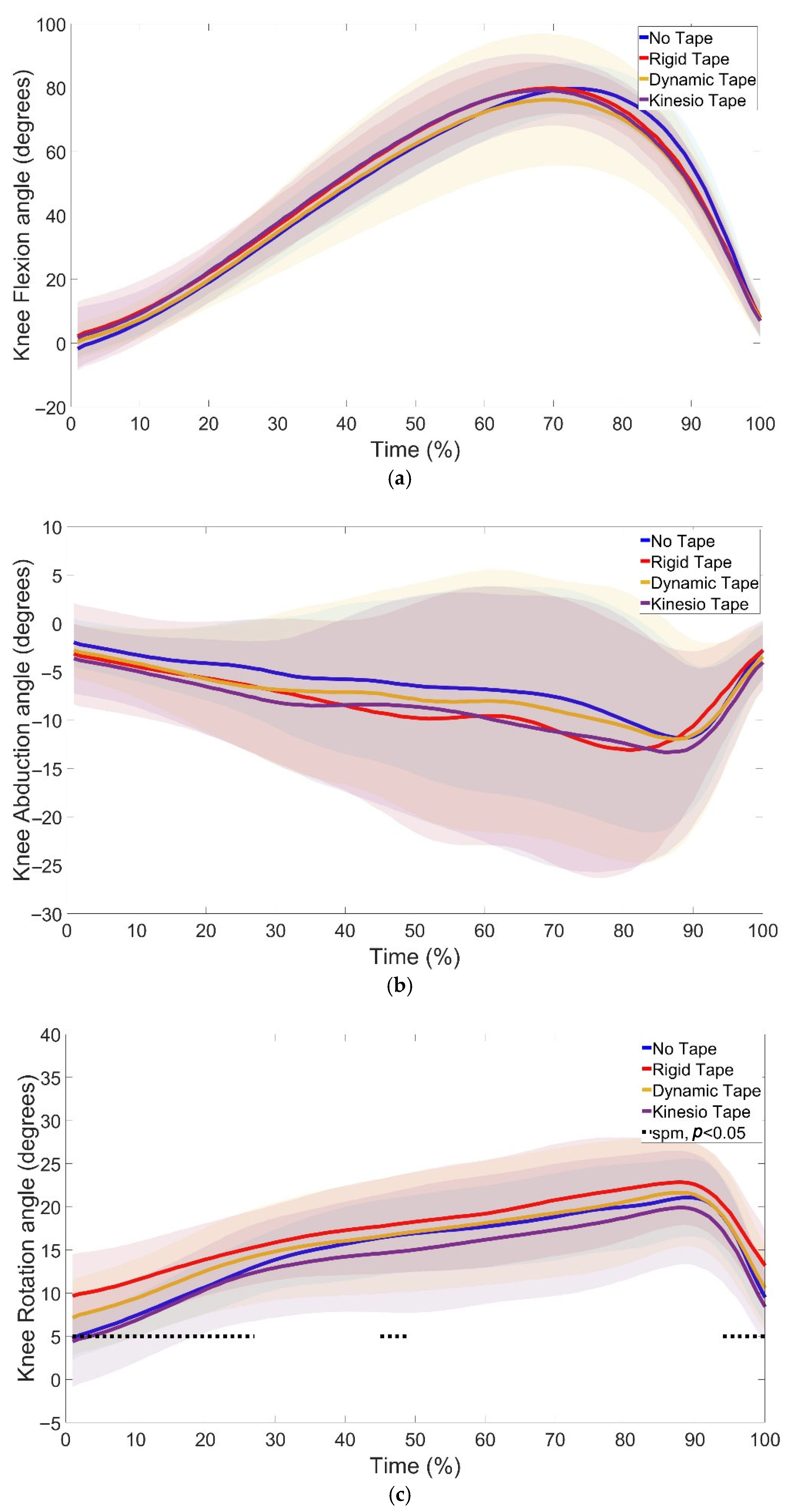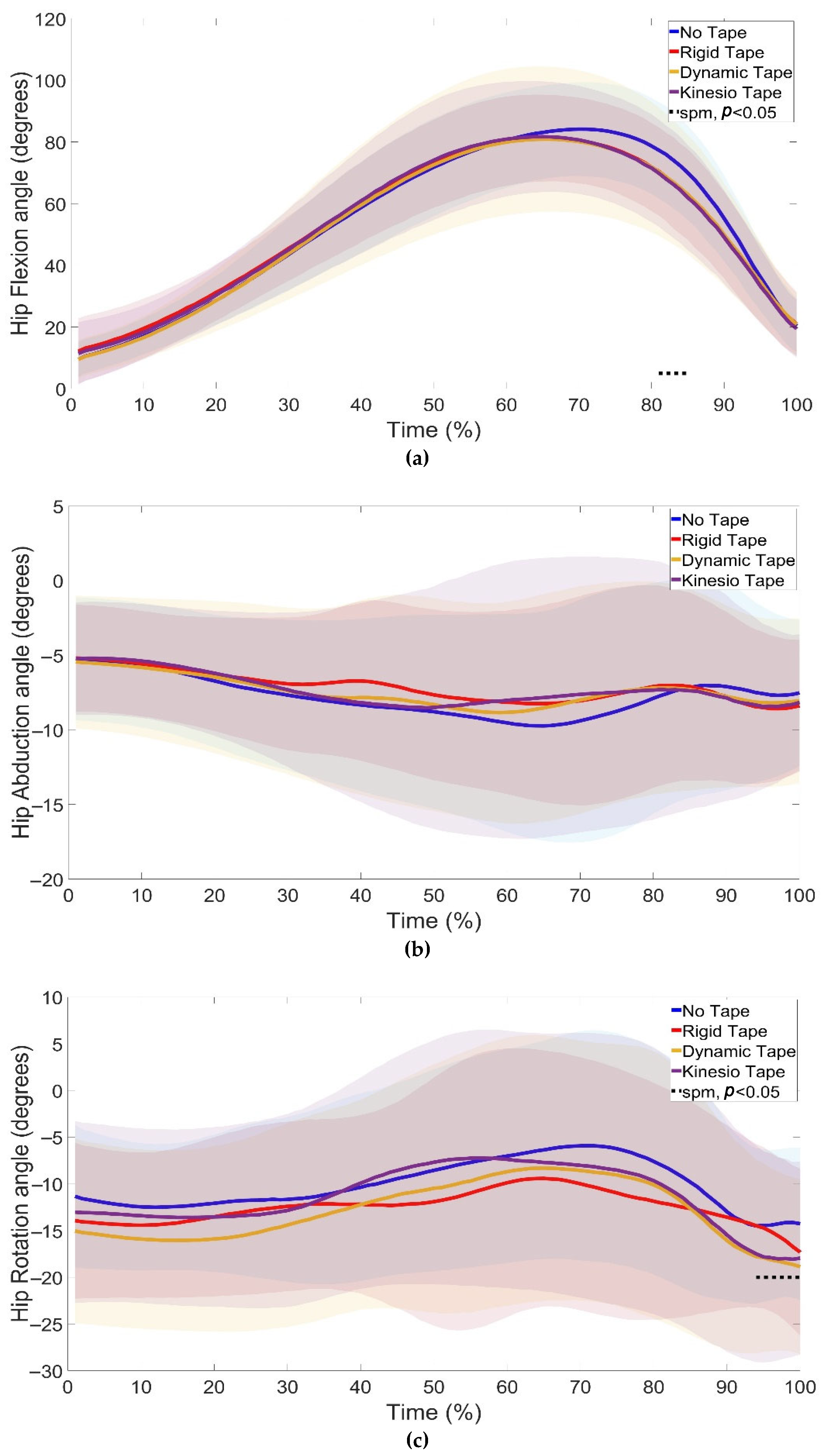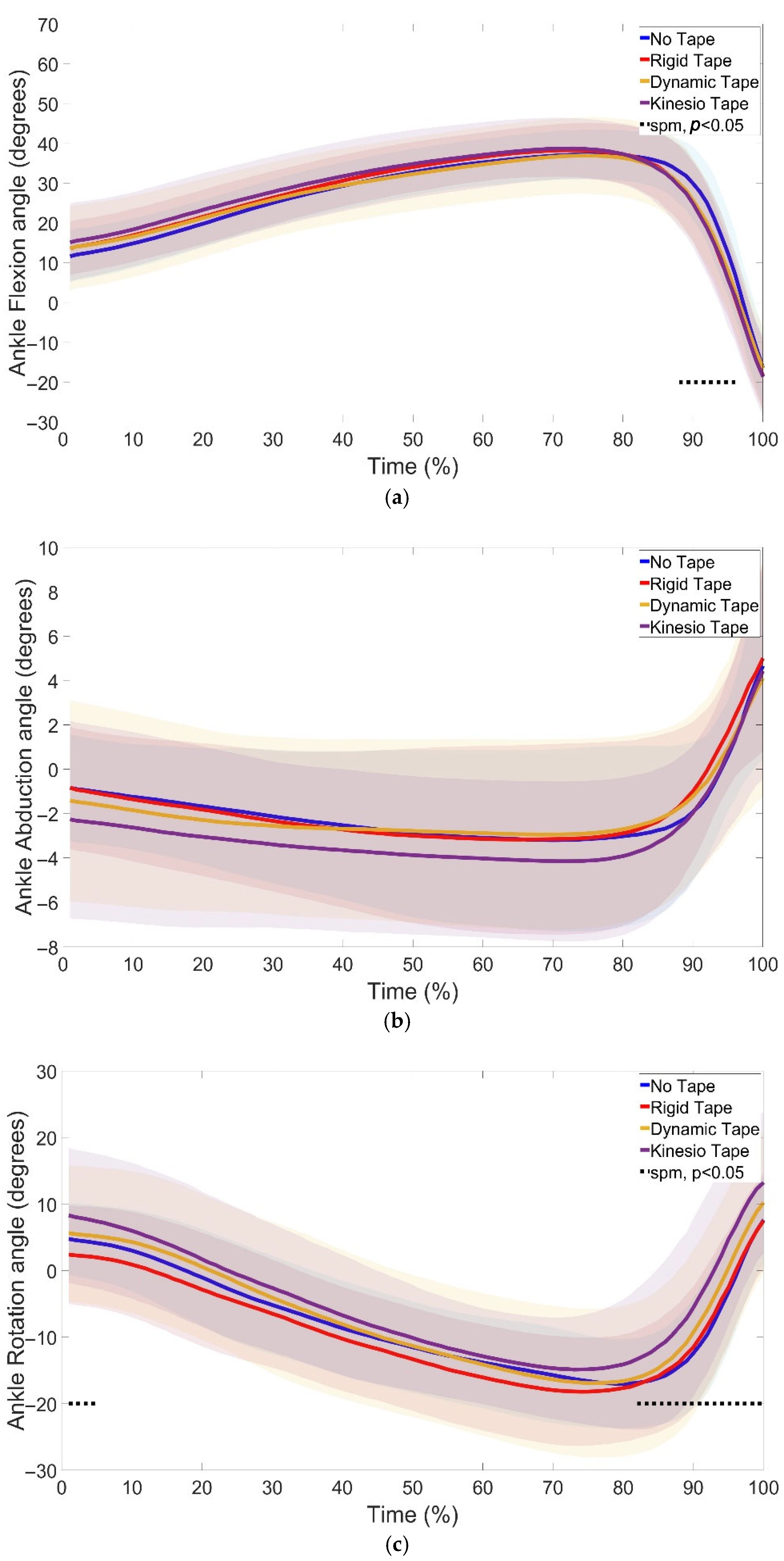 SPM1d analyses of joint kinematics revealed significant changes in ankle (Figure 4), knee (Figure 5), and hip (Figure 6) angles under different taping conditions.