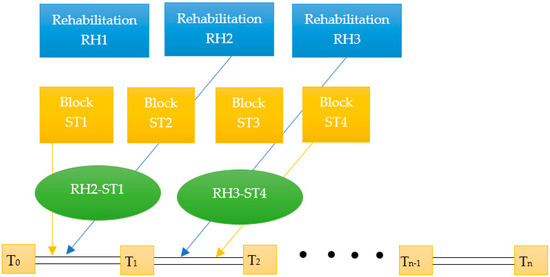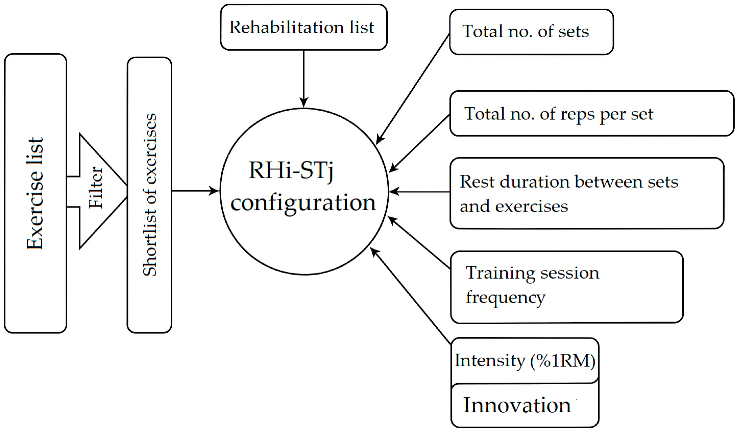 j strategic mix. In the first row, the rehabilitation strategies (RH1, RH2, …) are shown, while in the second row, the strength training blocks (ST1, ST2, …) are presented. These blocks can be combined in various personalized configurations (RH
