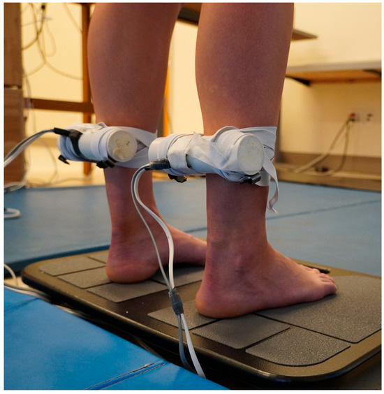 Vibrators, 15 cm long, 3.8 cm in diameter (BestTong, China https://www.besttong.co/, A00000531), equipped with an accelerometer (Dimension Engineering, Hudson, OH, USA, DE-ACCM6G), were attached bilaterally to the TS muscle. Elastic straps limited vibration of nearby tissues [29] (Figure 1). After attachment, each vibrator was calibrated to vibrate at 80 Hz (digitized at 10,000 Hz, Micro 1401, Spike2 software, version 7.17, Cambridge Electronic Designs, Milton, UK). All vibration stimuli were simultaneously applied bilaterally. Subjects then received two seconds of vibration to experience it and minimize startle response at trial onset. To prepare subjects for possible unexpected sensations, they were instructed that the vibrators would vibrate their muscles, that they may perceive a shift in their body position, and that they were to let the body automatically handle its balance. They were instructed not to interfere with the sensations experienced, not to resist any body tilt, and a researcher was positioned nearby to prevent a fall if needed. Padded floor mats were placed around them for safety. Briefing subjects on what to expect during the experiment increases safety and the likelihood of them experiencing the vibration movement illusion [26,30]. However, the instructions did not specify the direction to prevent intentional responses by subjects. Subjects were randomly assigned to the testing sequence of EO, followed EC, or the reverse. For each trial, the subject adopted the condition for 20 s, to allow time for adaptation to the new sensory condition [31,32], then data collection from the force plate was initiated. Twenty seconds later, vibration was initiated and continued for 20 s. During the 40 s period BTrackS™ Assess Balance software (version 7.5.6, Balance Tracking Systems, San Diego, CA, USA) recorded the subject’s COP on the force plate at 25 Hz. During EO trials, subjects gazed straight ahead at a self-selected spot in a poster positioned at eye level, positioned 300 cm away. A visual target was employed to decrease standing sway during the EO test [33] and enhance the difference between the EO and EC conditions, compared to staring at a blank wall. The EC condition was produced by the subject closing their eyes, which was monitored. Diffused room lighting from above ensured that no source of light information could provide motion information during EC testing. In both the EO and EC conditions, the head and eyes were held in a forward-facing position to minimize possible effects of head or eye movement on posture [34,35]. If during a trial a subject moved more than the typical illusion-induced body sway, the trial was rejected and repeated once after a 5 min seated rest period. To minimize a possible post-vibration carryover effects between trials [36], subjects had five minutes of seated rest between trials [25,27], and each trial condition of EO and EC was conducted only once. The use of a single trial for each condition is common in muscle vibratory studies [12,13,25,27,37,38,39]. To minimize muscle thixotrophy effects, subjects stood from a seated resting position immediately before each trial, moving directly onto the force plate, to ensure a similar muscle contraction history across both conditions [40]. To demonstrate that the vibration frequency did not change once set, the above procedures were repeated six times in each of two subjects with EO during both trials. The frequency of the vibrators were recorded during setup, the first trial and the second trial, for each of the right (R) and left (L) legs. The COP data from these trials for these two subjects was not recorded.