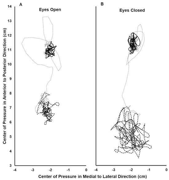 Center of pressure (COP) record during the eyes open (A) and eyes closed (B) trials for a single subject. The COP path during the initial 15 s period analyzed with no vibration (solid line), the final 15 s period analyzed with vibration (thick dashed line), and the 10 s interval between these periods (thin dotted line). In the anterior–posterior direction, greater positive values indicate a more anterior position.