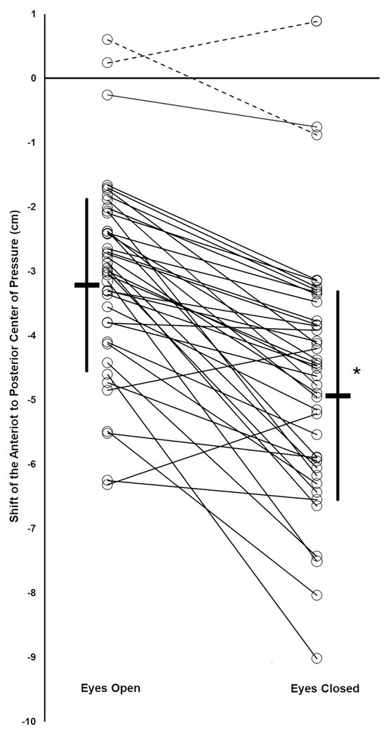 Vibration induced a shift in the anterior–posterior (AP) center of pressure (COP) of the subjects. Group mean values (thick horizontal bars) with standard deviation (thick vertical lines). For each subject, their AP COP shifts during EO and EC conditions are shown by open circles, with thin lines connecting the EO and EC data for the same subject (thin solid lines: subjects who responded to the muscle vibration during the EO condition; thin dotted lines: subjects who did not respond to the muscle vibration during the EO condition). * Significant difference between EO and EC condition means.