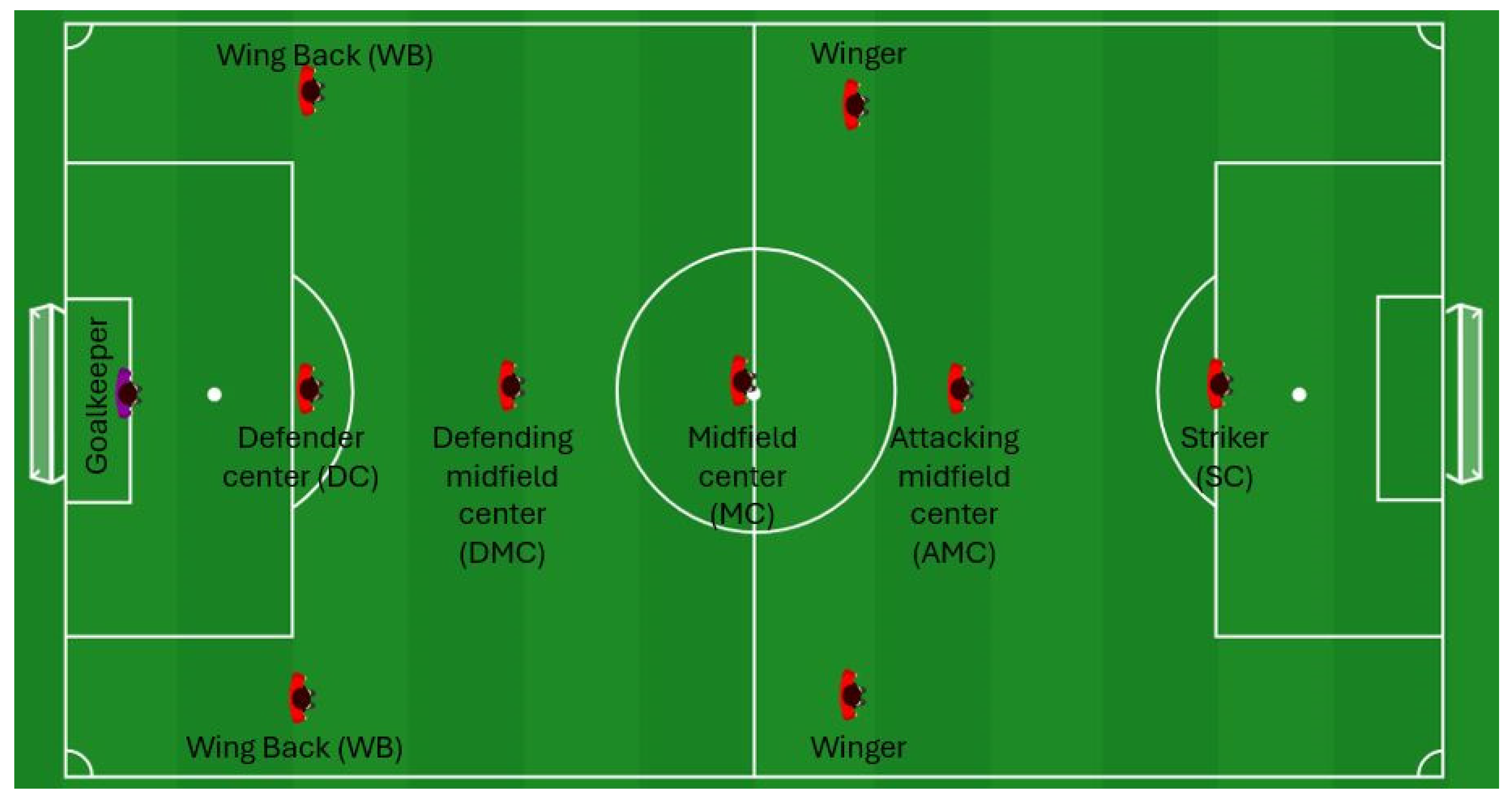 35]. This reflects the demands of modern soccer, where coaches expect WBs not to remain solely in defense but to advance and provide attacking width when the team is in possession. Conversely, wingers are often required to track back and support defensively, either by doubling up against the opposing winger or by covering the weak side when the ball is played to the opposite flank and the WB tucks inside to maintain compact distances within the defensive line.