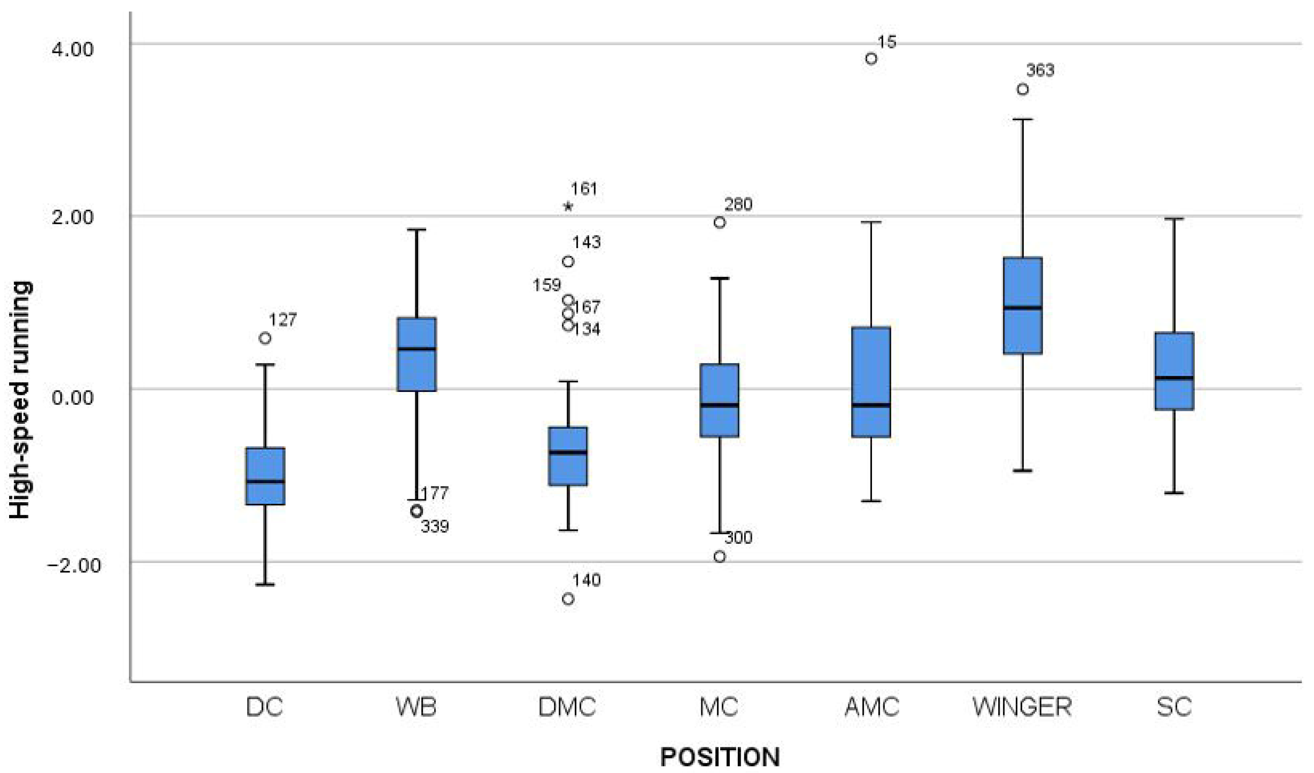 36] reported that players in lateral positions covered significantly greater high-speed distances compared to central players, both in each half separately and across the full match duration. Moreover, this pattern appears to be consistent across different populations, as has also been confirmed in studies on female players [