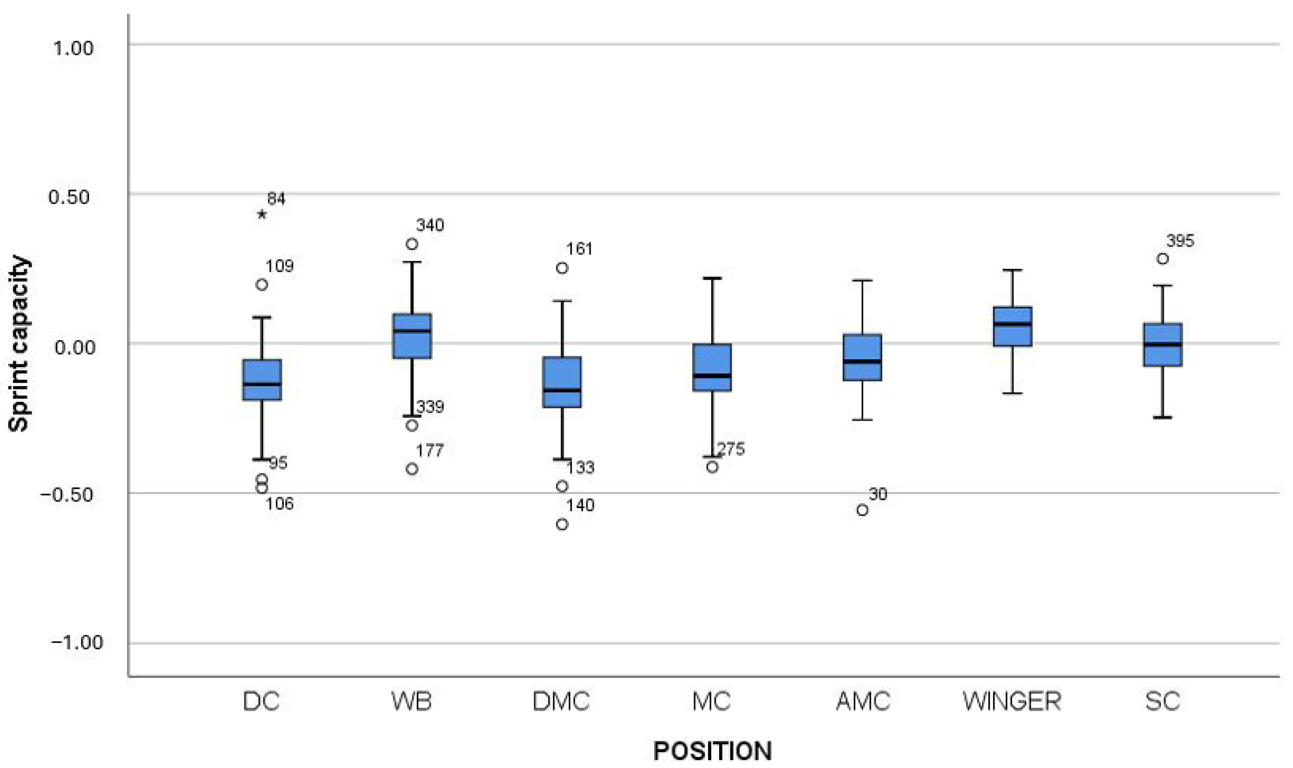 33]. This can be explained tactically by the fact that wide players frequently operate in situations where they can exploit available space. Unlike central players, who often act in congested zones with limited room and heavy defensive pressure, wide players more often have the opportunity to run through open corridors (flanks) with greater distance ahead of them [