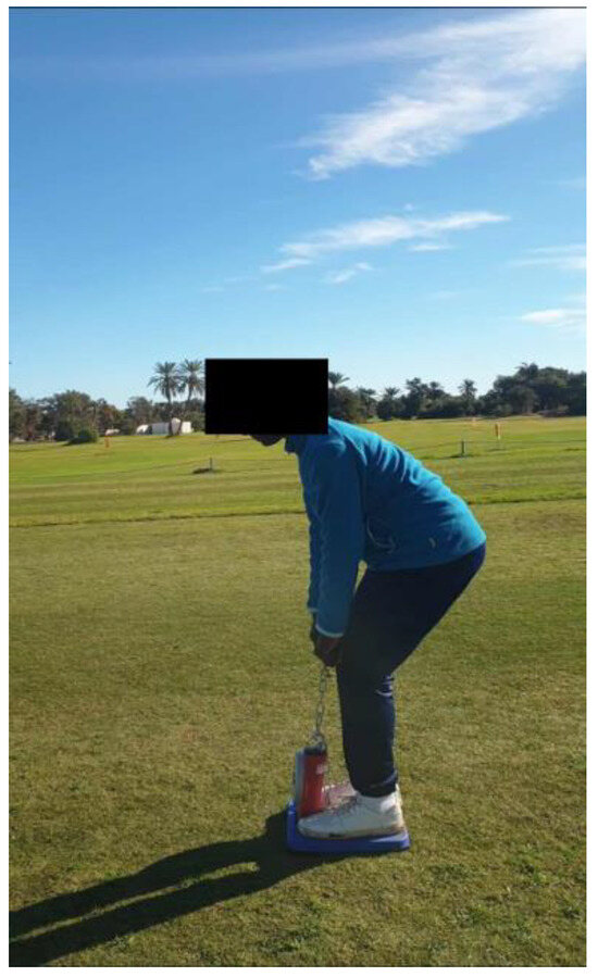Maximal isometric back extensor strength was measured in kilograms using a back and leg dynamometer (Takei, Tokyo, Japan) as previously described [14,15]. All assessments were conducted in the same open-field setting (Figure 1), using an identical testing station placed on a firm, level surface. To minimize diurnal variation and environmental influences, measurements were performed at a consistent time of day (16:00–18:00 h) under comparable ambient conditions (temperature: 24–27 °C; humidity: 50–60%). Subjects stood on the dynamometer foot platform with feet shoulder-width apart and gripped the handlebars aligned across the thighs. The dynamometer chain was adjusted so that the knees were flexed at approximately 130° and the trunk was flexed at approximately 30°, positioning the bar at the patella level. The knee (≈130°) and trunk (≈30°) flexion angles were visually estimated to approximate the posture typically adopted during the golf swing, based on previously reported biomechanical data of youth and adult golfers [16,17]. This setup allows recruitment of the trunk extensors while maintaining a stable lower-body base, reflecting the combined contribution of hip, knee, and trunk musculature to force production in a position relevant to golf-specific performance.