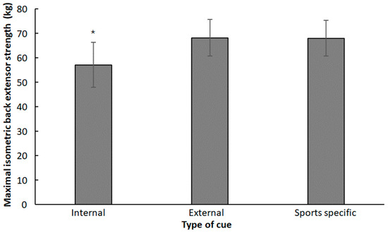 A significant difference between the types of cues was found on maximal isometric back extensor strength with a large effect (F1.2,15.67 = 6.83, p = 0.004, ηp2 = 0.34). Post hoc comparisons revealed that maximal isometric back extensor strength was significantly lower when using internal cues (~11.0 kg, 16.2%) compared to the other two types of cues (Figure 2).