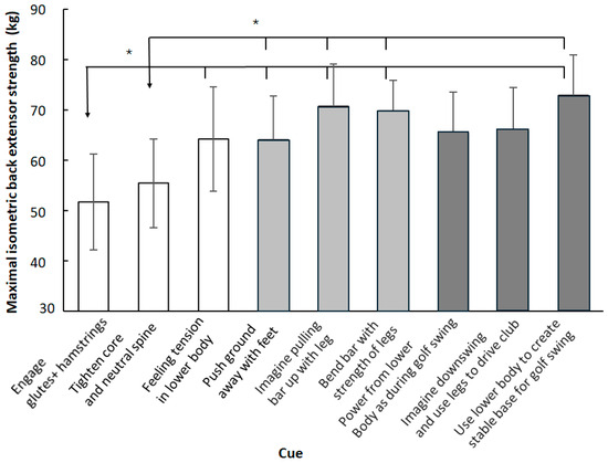Background: Attentional focus strategies, including internal, external, and sport-specific cues, can influence muscle strength by modulating motor control. However, their acute effects on maximal isometric back-extensor strength in youth athletes under controlled laboratory conditions remain unclear. Methods: Fourteen youth golfers (15.8 ± 0.5 years) performed maximal voluntary isometric back-extension tasks under nine cueing conditions: three internal, three external, and three golf-specific. The task involved exerting maximal force against a fixed, immovable resistance while maintaining standardized trunk and hip positions to ensure consistent execution. Cueing was delivered verbally in a standardized manner across participants and sessions. Maximal isometric strength was compared across conditions using repeated-measures analyses. Results: Maximal isometric back-extensor strength was significantly (p = 0.004 ηp2 = 0.34) lower with internal cues (57.1 ± 16.0 kg) compared with external (68.2 ± 13.0 kg) and golf-specific (68.1 ± 12.5 kg) cues. Specifically, the internal cues ‘engage your glutes and hamstrings’, ‘tighten your core’, and ‘maintain a neutral spine’ produced lower force than all external cues and the golf-specific cue ‘focus on using your lower body to create a stable base for your golf swing’. Among internal cues, ‘engage your glutes and hamstrings’ resulted in the lowest torque. Conclusions: External and certain golf-specific verbal cues acutely enhance maximal isometric back-extensor force more effectively than internal cues in a controlled laboratory setting. While these results inform how attentional focus can modulate acute force output in youth athletes, the task does not replicate the dynamic, rotational nature of the golf swing, and the findings should not be interpreted as direct indicators of golf performance. Future research should explore long-term adaptations and assess transfer to sport-specific, dynamic movements.