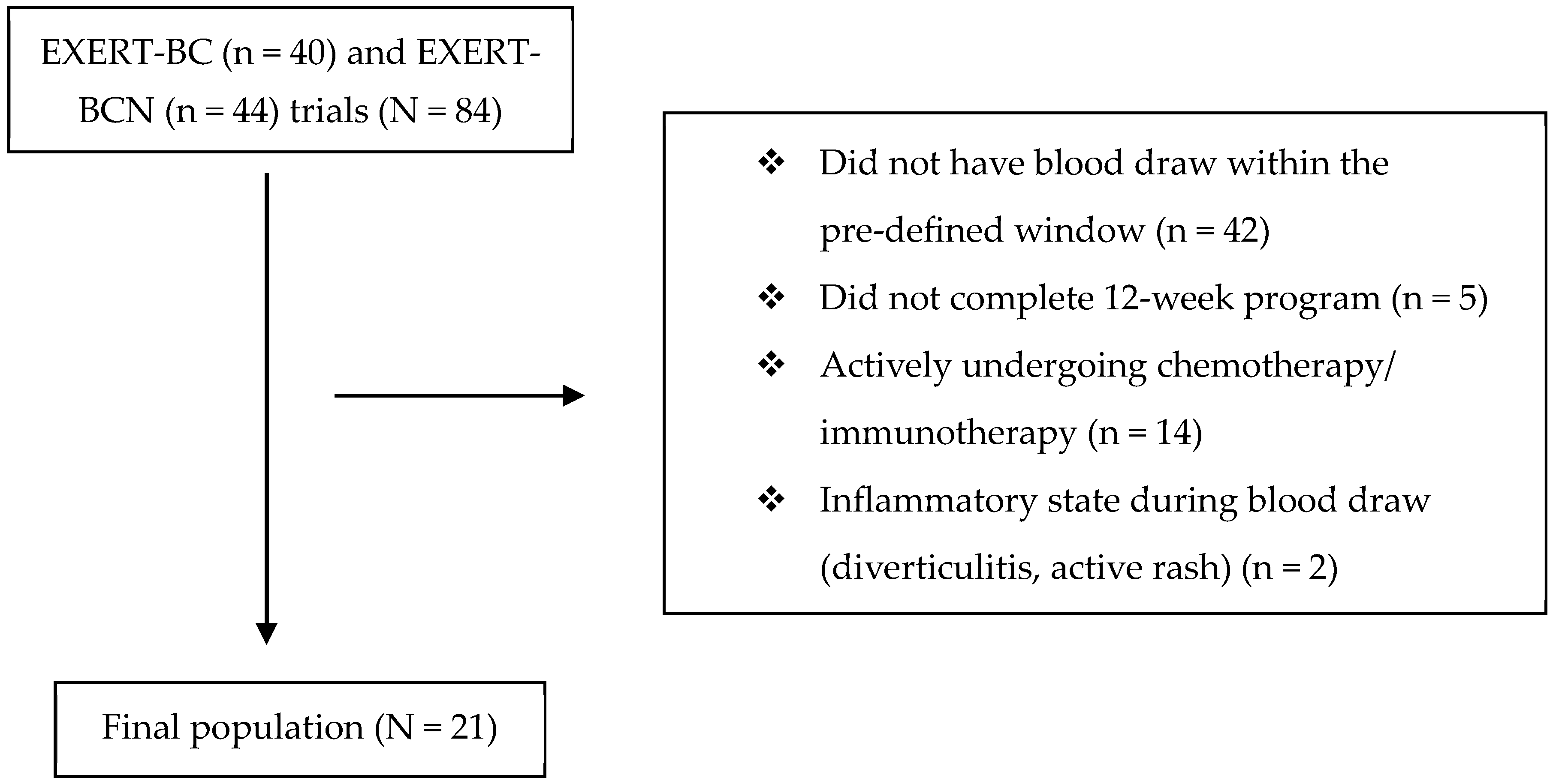 - Carpenter, D.J.; Peluso, C.; Hilton, C.; Velasquez, F.; Annichine, A.; Matsko, K.; Rosenberg, J.; Diaz, A.K.; Hyde, P.; Beriwal, S.; et al. EXERT-BC: A pilot study of an exercise regimen designed to improve functional mobility, body composition, and strength after the treatment for breast cancer. Cancer Med. 2024, 13, e7001. [Google Scholar] [CrossRef] [PubMed]
