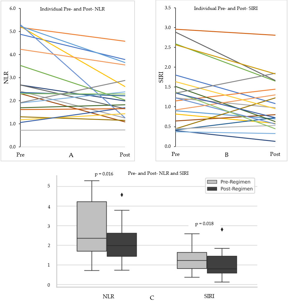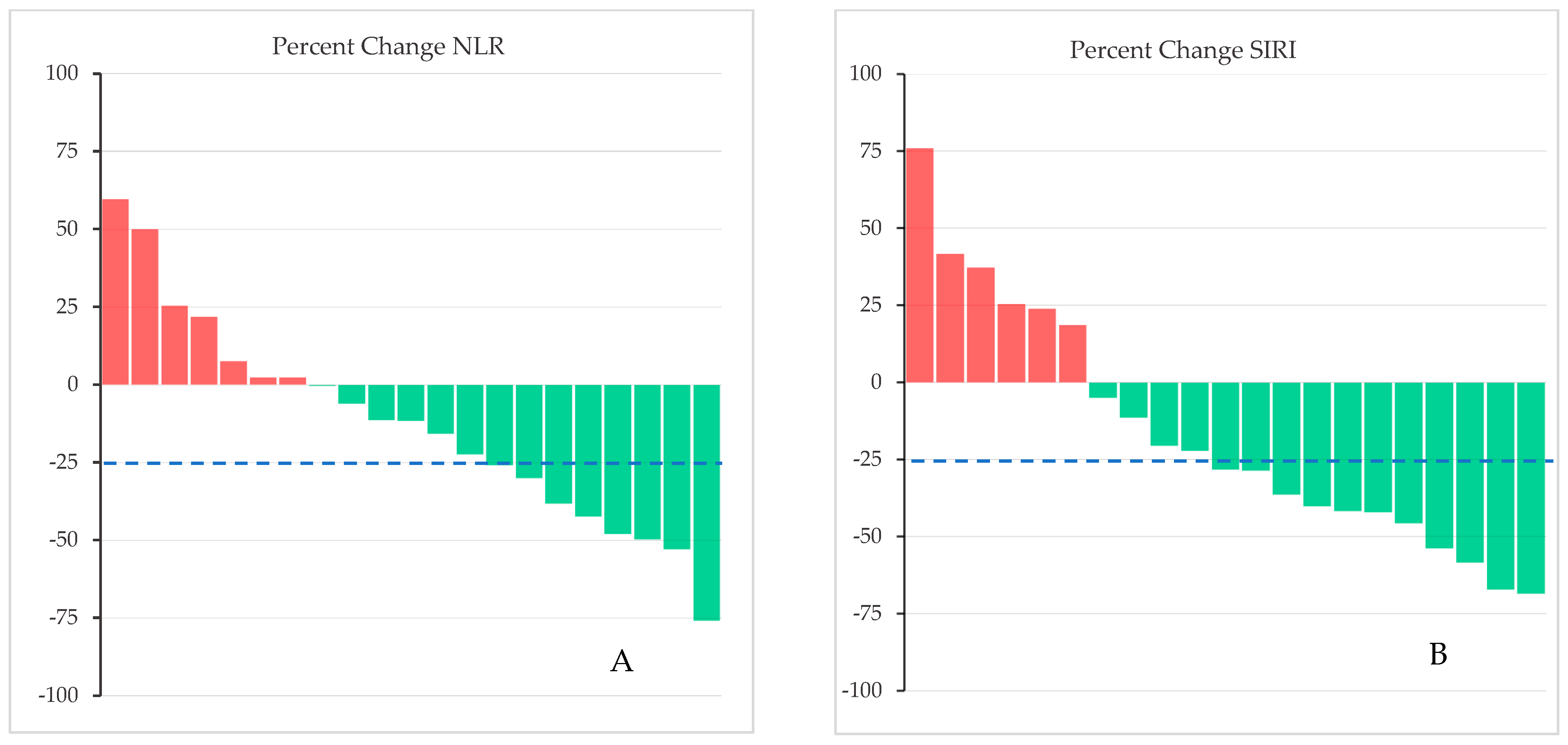 | Total Population (N = 21) | Those with an Increase in the SIRI (n = 6) | Those with a Decrease in the SIRI (n = 15) | Mann-Whitney p-Value | |