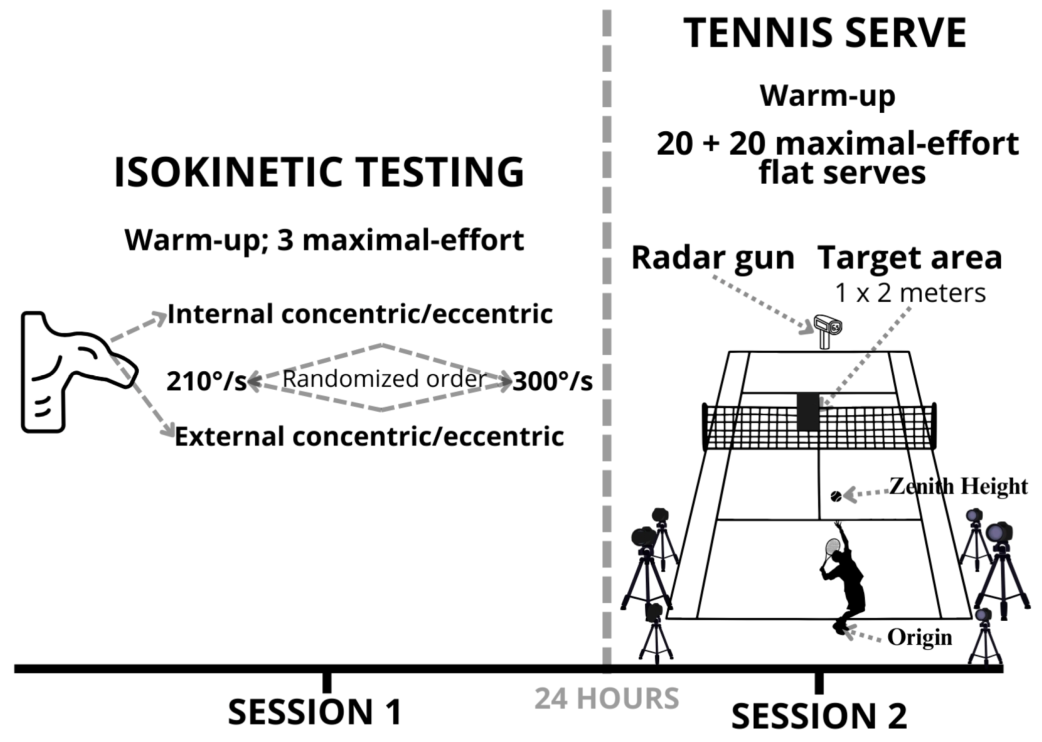 29] by integrating kinematic analysis of the tennis serve with isokinetic shoulder strength testing. The testing protocol comprised two sessions conducted 24 h apart (