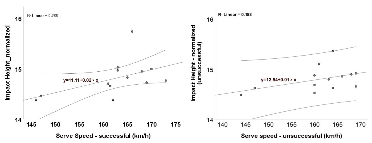 2 ≈ 0.62 and 0.60, respectively). These regressions are descriptive only; statistical inference is based on Spearman’s ρ. This indicates that higher impact points are, on average, associated with faster serves across outcomes. When impact height was normalized to body height (