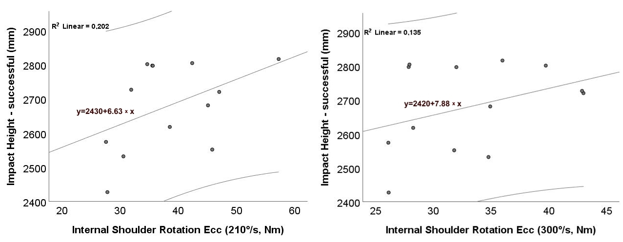 2 values (≈0.20 and 0.14) indicate weak linear associations. Accordingly, while eccentric shoulder strength may relate to slightly higher impact heights, it alone explains only a small portion of the variance.
