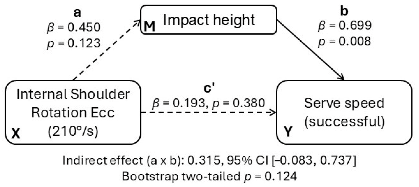 Successful serves. In the model with impact height, the a-path was positive but non-significant (β = 0.450, p = 0.123, 95% CI [−0.13, 0.81]), whereas the b-path was positive and significant (β = 0.699, p = 0.008, 95% CI [0.23, 0.90]). Thus, players who contacted the ball higher tended to achieve higher serve speeds even after accounting for shoulder strength, but shoulder strength itself did not reliably predict impact height. The indirect effect was a×b = 0.315 with 95% CI [−0.083, 0.737] (bootstrap two-tailed p = 0.124; 5000 resamples), and the direct effect c′ was small and non-significant (β = 0.193, p = 0.380, 95% CI [−0.28, 0.63]). Explained variance was moderate (R2 = 0.49 for the mediator model and R2 = 0.61 for the outcome model). For the other mediators, indirect effects were likewise non-significant: zenith height (a = −0.015; b = 0.397; a × b = −0.006; 95% CI [−0.396, 0.334]) and zenith–impact differential (a = −0.324; b = 0.149; a × b = −0.048; 95% CI [−0.234, 0.365]).