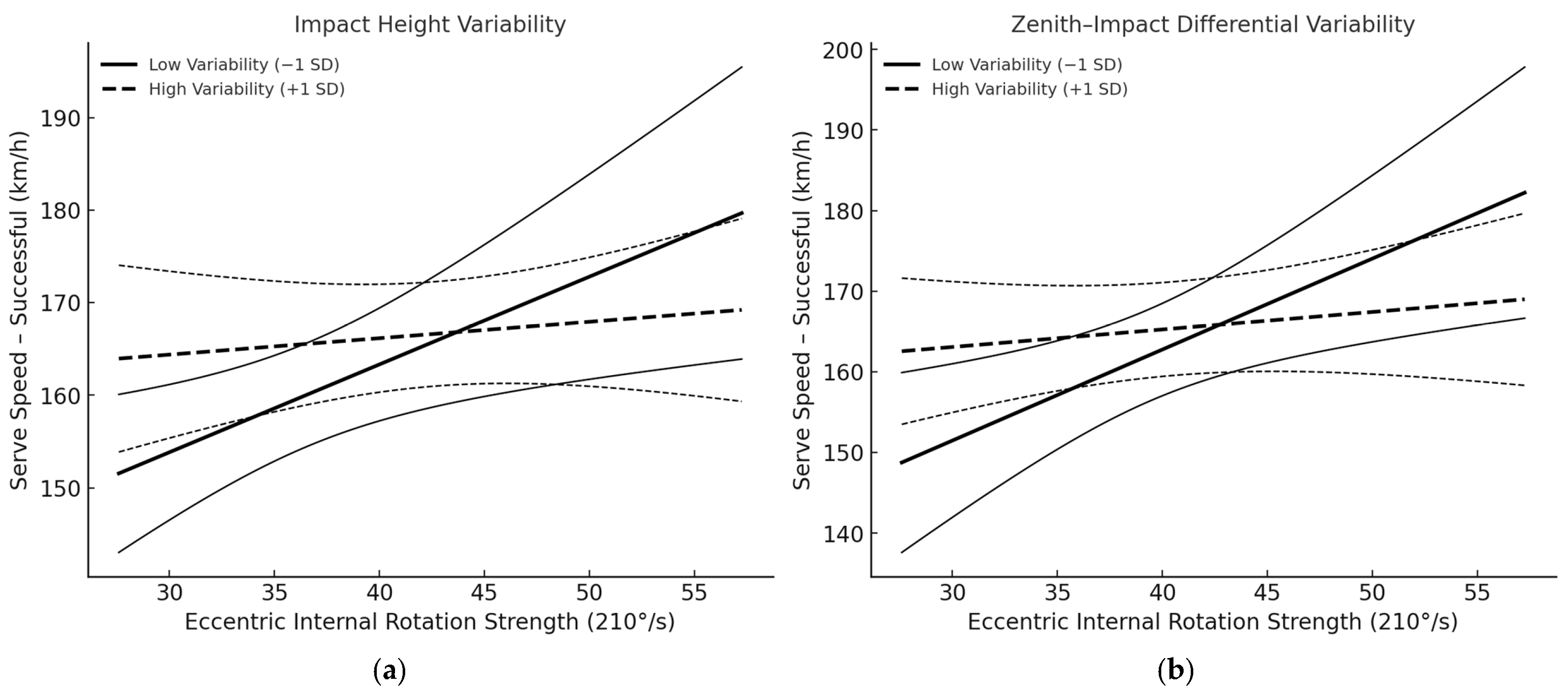 Moderation analyses showed that toss variability (operationalized as the SD of impact height and of the zenith–impact differential across trials) significantly moderated the strength–speed association for successful serves. This moderating effect was observed only for successful serves. The absence of a similar pattern in unsuccessful serves may reflect self-selection of more optimal contact conditions during effective trials or limited statistical power to detect smaller effects. Specifically, simple-slopes tests indicated a positive strength–speed slope under low variability but a flat, non-significant slope under high variability. In practical terms, greater toss consistency amplifies the translation of shoulder-rotator strength into ball speed, whereas erratic kinematic execution dampens or nullifies this translation. This pattern aligns with work linking toss consistency and contact-point control to serve outcomes and with kinetic-chain accounts emphasizing that high racket-head speed emerges from repeatable timing and coordinated proximal-to-distal sequencing, rather than from isolated torque alone [