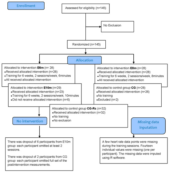 Eight participants were excluded due to non-compliance: six from E10m (missed ≥2 sessions) and two from CON (missed all post-intervention assessments). In addition, 14 missing heart rate values recorded during HIIT sessions were statistically imputed. The allocation process is illustrated in Figure 1.