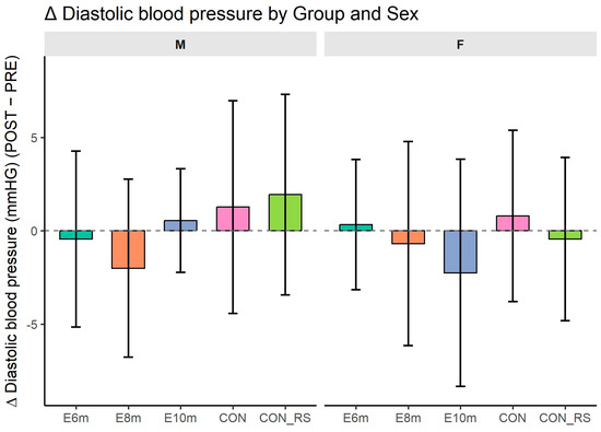 Changes (Δ = POST − PRE) in diastolic blood pressure (sbp) across intervention groups and sexes. Bars represent mean Δ values ± 95% CI; dashed line indicates zero change. Abbreviations: M—males; F—females; 6 min, 8 min, 10 min—experimental groups differing in session duration; CON—control group of non-responders; CON_Rs—control group of previous responders.