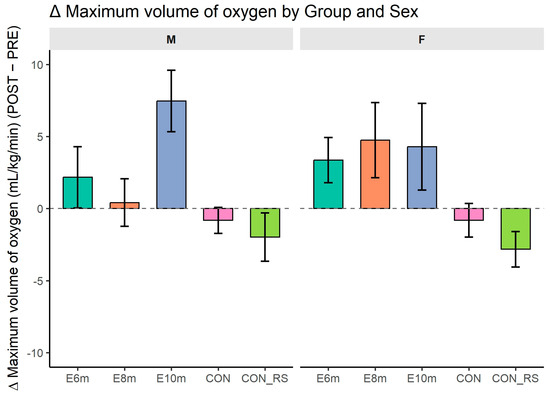 Changes (Δ = POST − PRE) in maximal oxygen consumption (VO2max) across intervention groups and sexes. Bars represent mean Δ values ± 95% CI; dashed line indicates zero change. Abbreviations: M—males; F—females; 6 min, 8 min, 10 min—experimental groups differing in session duration; CON—control group of non-responders; CON_Rs—control group of previous responders.