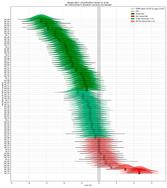 Individual Bayesian classification of training responses based on changes in body fat percentage (ΔBF%). Each participant is categorized as a responder (green), non-responder (red), or uncertain (shaded gradient) according to the 89% Highest Density Interval (HDI) and the Region of Practical Equivalence (ROPE, ±0.05). Abbreviations: HDI—Highest Density Interval; ROPE—Region of Practical Equivalence; Δ—change; BF%—body fat percentage; R—responder; NR—non-responder.