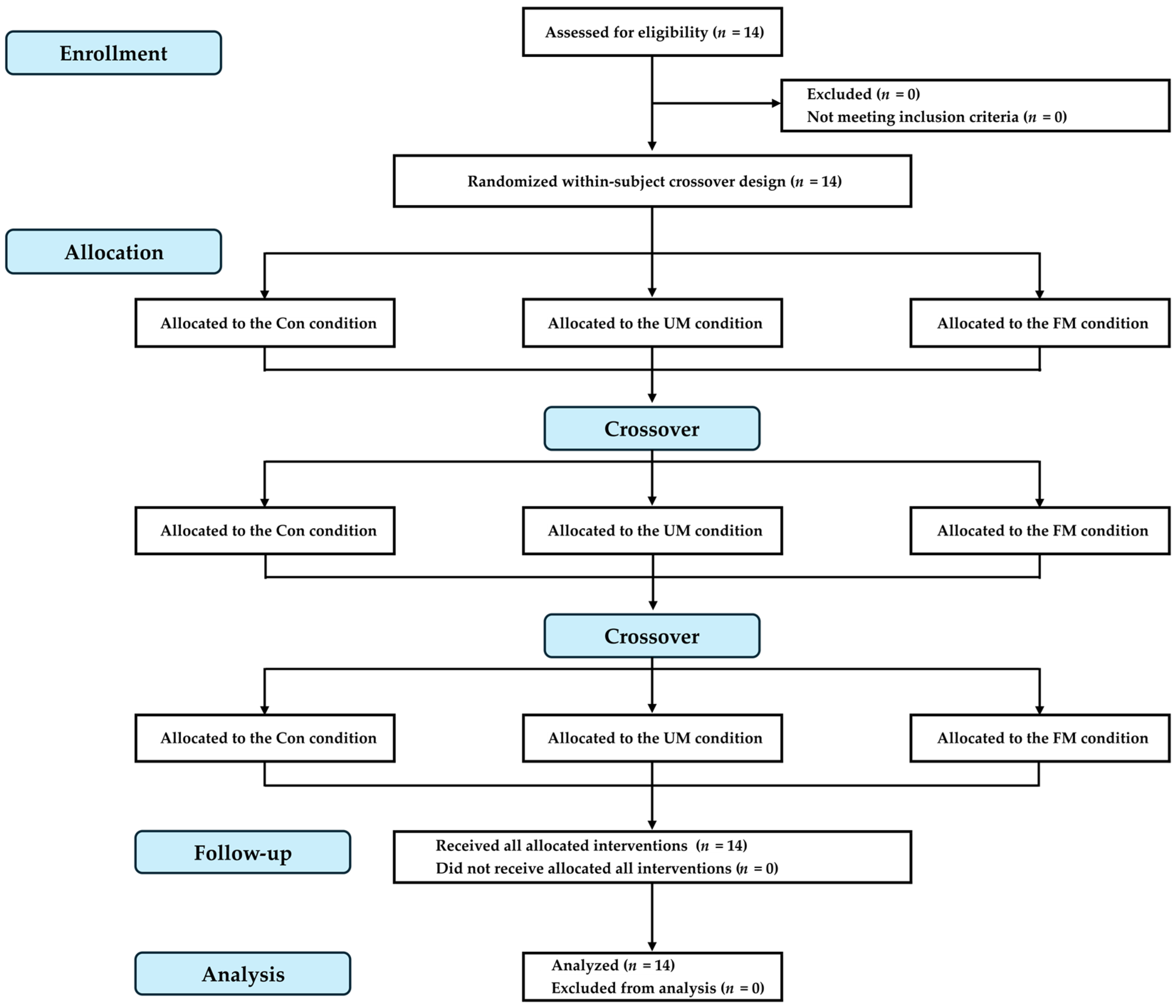 All participants received a detailed explanation of the study procedures and content in advance, and provided written informed consent. They completed all 3 experimental conditions (Con, UM, and FM) in a randomized order.