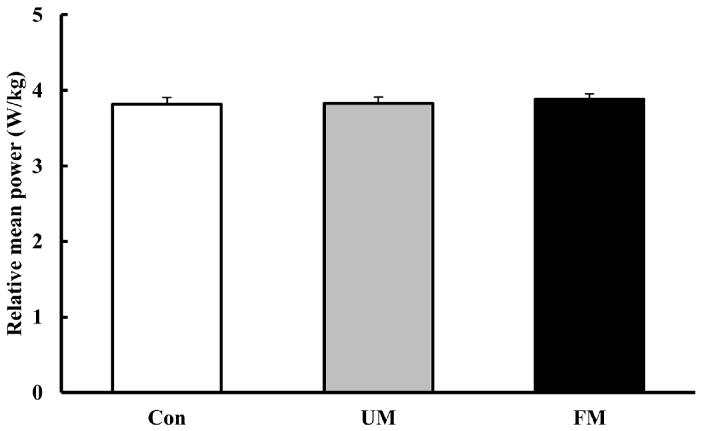 Figure 3 shows relative peak power (W/kg) across the 3 music conditions. Analysis of variance revealed a significant difference across conditions (F(2, 26) = 4.93, p < 0.05, ηp2 = 0.28). Post hoc comparisons showed that the FM condition yielded significantly higher values than the Con condition (Mdiff = 0.19, p < 0.01, d = 1.05). Although not statistically significant, the FM condition tended to be higher than the UM condition (Mdiff = 0.12, p = 0.095, d = 0.54).