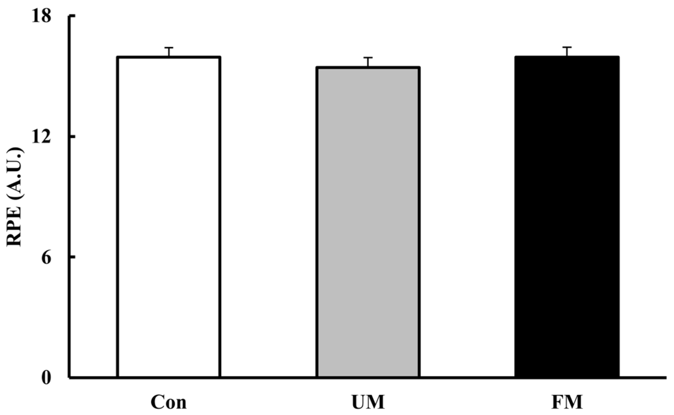 Figure 8. Rating of perceived exertion (RPE, A.U.) across the 3 music conditions after 20 s maximal pedaling. Values are presented as mean ± SEM (n = 14). A one-way repeated-measures ANOVA revealed no significant differences across conditions (p = 0.332). Con: control; UM: unfamiliar language music; FM: familiar language music. Bar colors indicate stimulation level: white (Con), gray (UM), and black (FM).