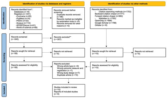 Literature searches conducted across six different databases and finalized on 24 September 2025, yielded 441 articles. After removing 96 duplicate articles and applying selection criteria to 345 articles based on title and abstract, 307 articles were excluded. A comprehensive assessment of the full texts of 38 articles was subsequently conducted, which led to the exclusion of twenty-three articles: nine were excluded because of the wrong article type, seven were omitted because of a wrong outcome measure and registration, and the remaining seven were discarded because of a wrong study design. In addition to the main search, a backwards and forward citation search identified 1753 articles, and a gray literature search yielded 1793 articles. Fifteen articles were assessed for eligibility, but all were duplicates of those found in the main search. Finally, a total of 15 studies were included in the present review. Twelve were randomized controlled trials [,,,,,,,,], and the remaining three were quasi-randomized controlled trials [,,]. The details of the charting process can be seen in Figure 1.