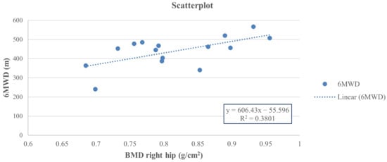 Pearson analysis between BMD of the right total hip (g/cm2) and 6MWD (m) (r = 0.617, p = 0.014) in group A.