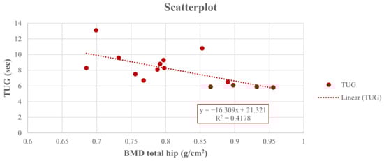 Pearson analysis between BMD of the right total hip (g/cm2) and TUG (sec) (r = −0.642, p = 0.001) in group A.