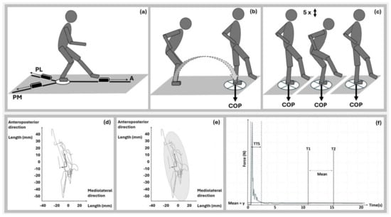 The participants were instructed to perform a forward jump (covering 50% of their body height) and land on a single limb positioned on a force plate, with their hands resting on their hips (Figure 1b) [,]. The COP movement in the horizontal plane was recorded, and the following variables were determined: (i) the COP movement trajectory length [] (Figure 1d), (ii) COP movement trajectory area [] (Figure 1e), and (iii) time needed for stabilisation [] (Figure 1f). Five trials were performed for each leg, and the mean values were used for the analysis. A smaller COP trajectory length and area and shorter time needed for stabilisation indicate better balance. A force plate (AMTI, Watertown, MA, USA) was used to collect the ground reaction force data at a sampling rate of 1000 Hz. The analogue signals from the force plate were amplified using an AMTI amplifier (Watertown, MA, USA) and recorded via a Vicon MX analogue to digital interface unit (Vicon Motion Systems Ltd., Yarnton, Oxford, UK). The data was filtered using a fourth-order zero-phase Butterworth digital filter [] with an estimated optimum cut-off frequency of 12.53 Hz [].