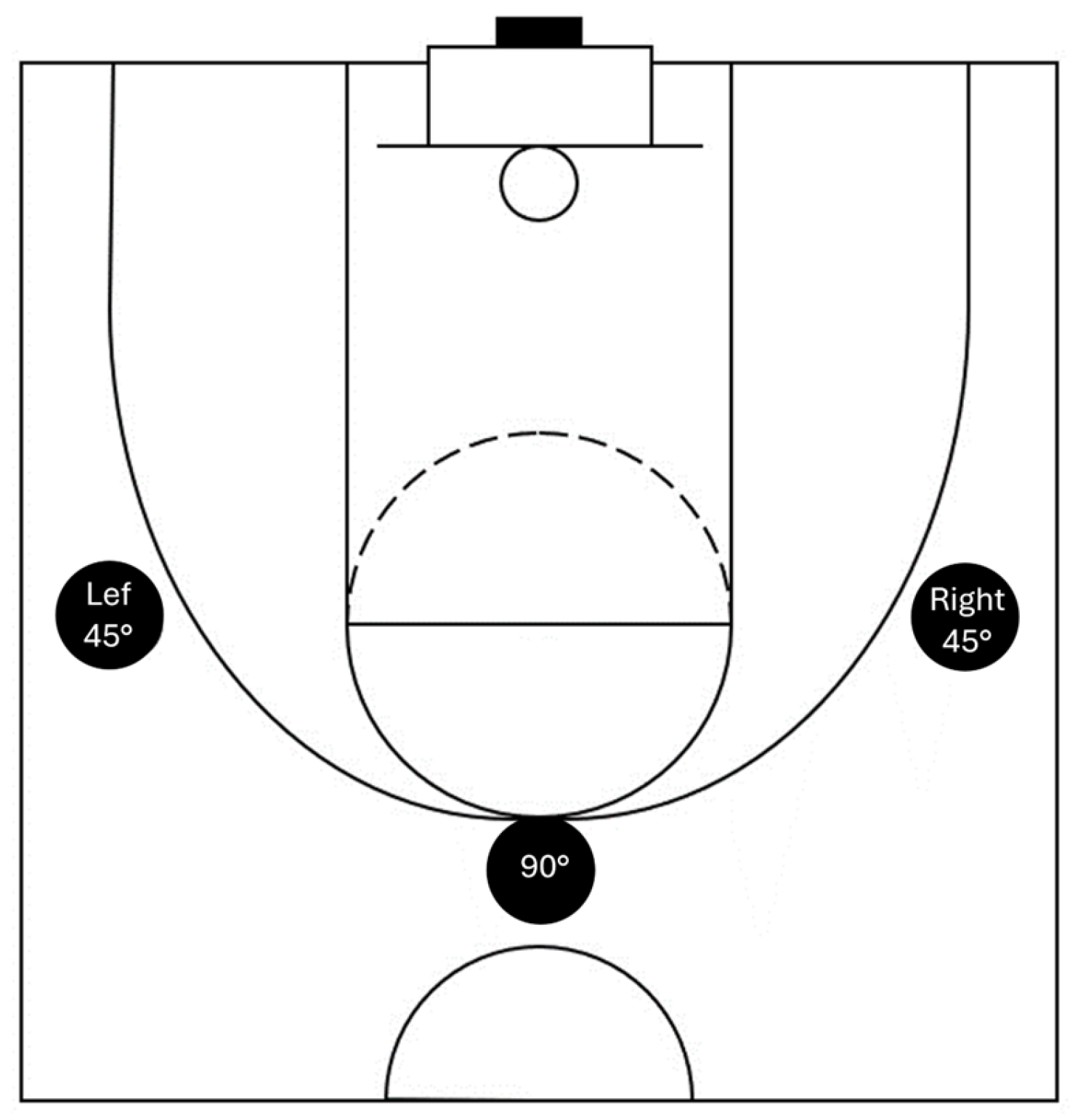 All athletes executed ten shots from three distinct shooting positions (right 45°, 90°, and left 45°), maintaining a consistent distance of 6.75 m from the board, (Figure 1) and under varying constraints (no constraints (B), simulated gym audience noise (N), and simulated opposition (O)). The shooting sequence was randomized to minimize the impact of factors such as learning effects and fatigue on performance. In basketball shooting, performance can vary due to external and internal factors (e.g., fatigue, focus). By randomizing the sequence, the likelihood of any single shot type consistently occurring at the end of the shooting sequence, where fatigue could be more pronounced, was minimized. Additionally, while the participants took 90 shots, this volume reflects typical training scenarios for basketball players, where repeated shooting is common. Given that the participants were skilled athletes accustomed to such physical demands, it is reasonable to expect that their endurance and capacity to maintain shooting performance were within normal ranges. By collecting 10 attempts in each condition, we average out inconsistencies and capture a representative mean performance for each condition. Research indicates that a minimum of 8–15 repetitions is often used for movement-based tasks to stabilize kinematic and kinetic data [1,29]. Athletes were given a 30 s rest period between conditions at the same position and a 2 min rest period between different positions.