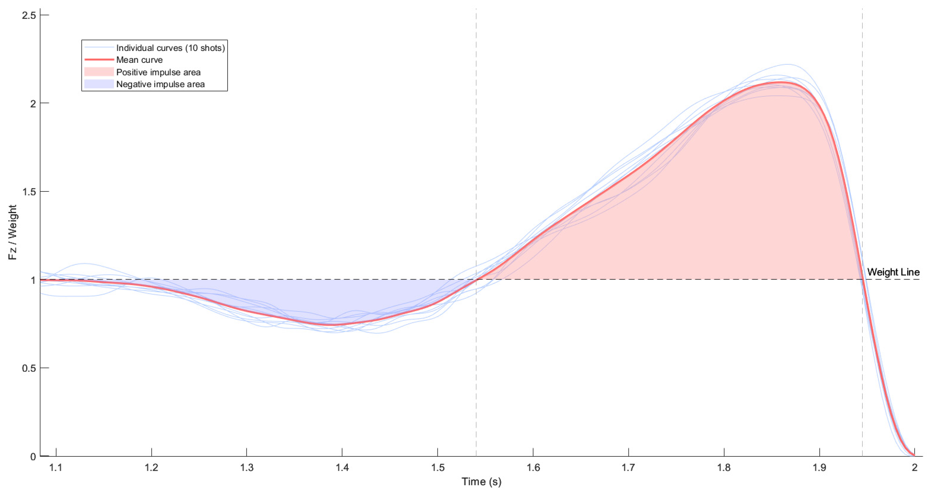 For each individual basketball shot, all calculations were based on raw, unnormalized data. Figure 2 illustrates an example of the vertical ground reaction force curve normalized to body weight for 10 shots in one shooting condition of one athlete, and a mean curve with the negative and positive impulse areas clearly delimited relative to body weight line.