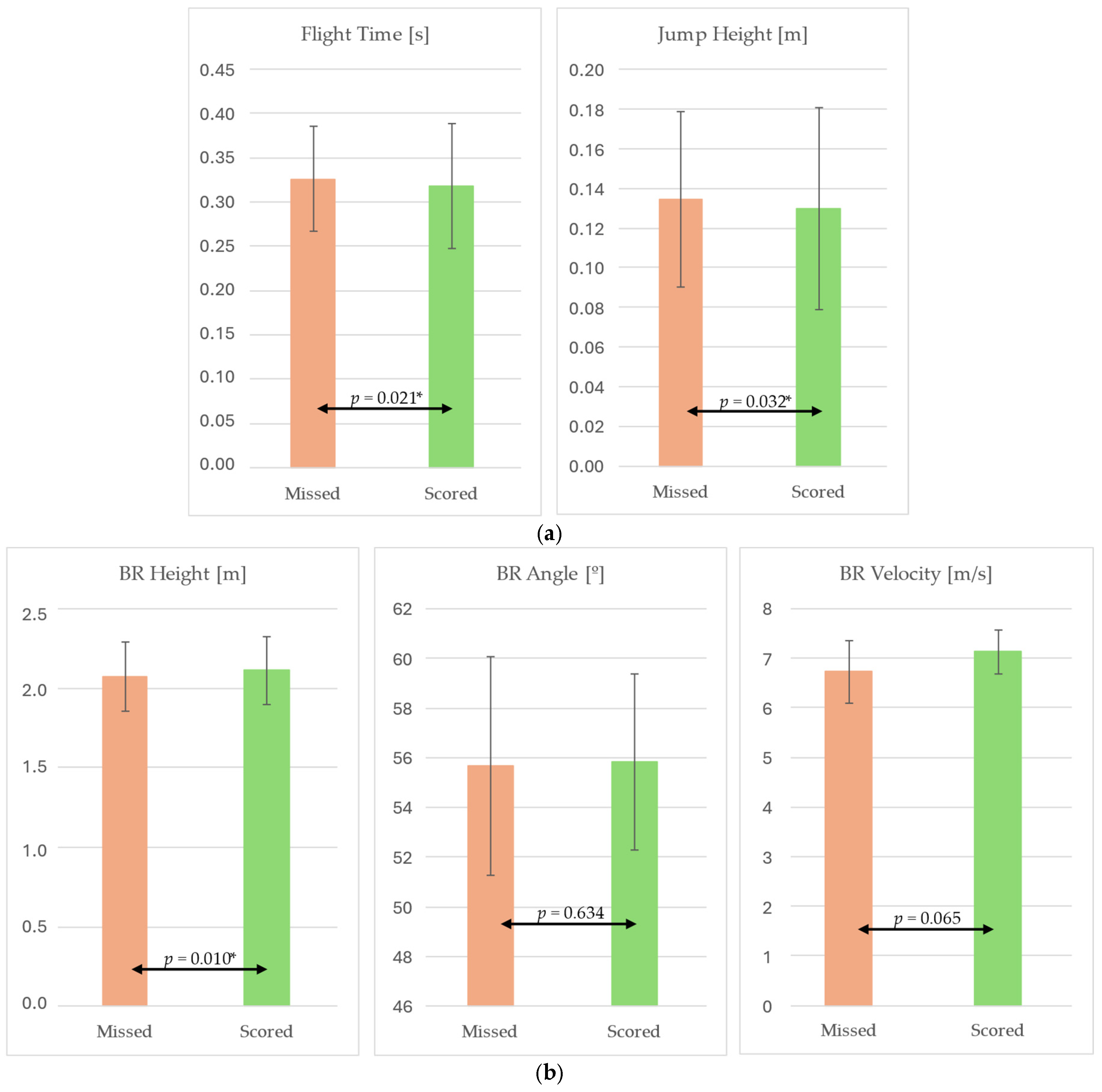 Significant differences were observed between successful (scored) and unsuccessful (missed) shots in flight time and jump height, with lower values recorded in scored attempts (Figure 5).