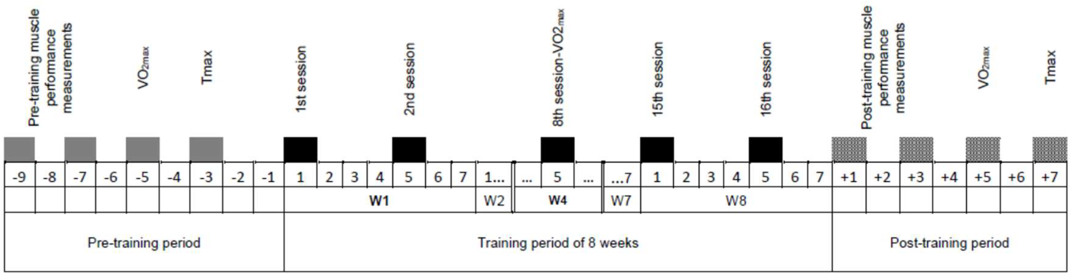 - Training period, during which two training sessions per week (in total 16 sessions) were conducted over 8 weeks.