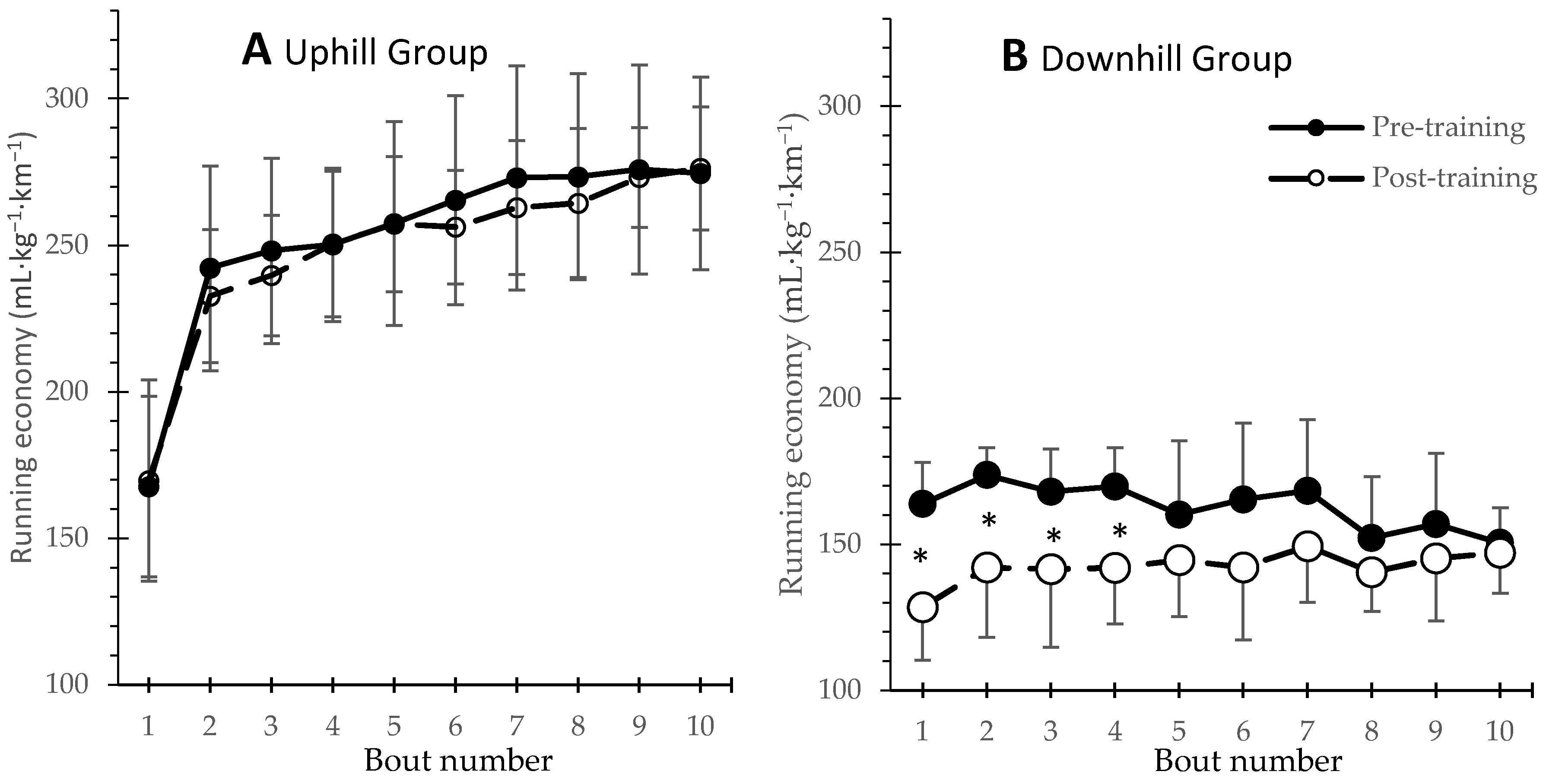 - Shaw, A.J.; Ingham, S.A.; Folland, J.P. The efficacy of downhill running as a method to enhance running economy in trained distance runners. Eur. J. Sport Sci. 2018, 18, 630–638. [Google Scholar] [CrossRef]