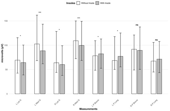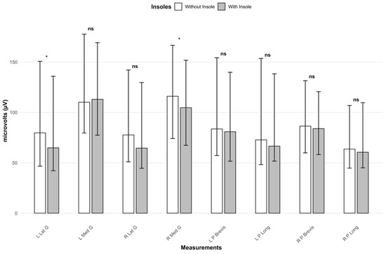 Representation of all electrical activity measurements from the first evaluation across two conditions (footwear with insoles, footwear without insoles). *: Significance level < 0.05. ns: Significance level > 0.05. L Lat G: Left lateral gastrocnemius. L Med G: Left medial gastrocnemius. R Lat G: Right lateral gastrocnemius. R Med G: Right medial gastrocnemius. L P Brevis: Left peroneus brevis. L P Long: Left peroneus longus. R P Brevis: Right peroneus brevis. R P Long: Right peroneus longus.