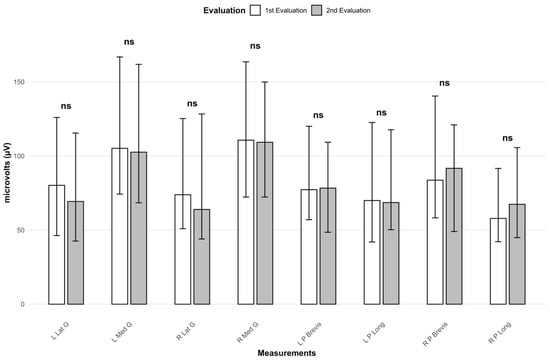 Representation of electrical activity in the first and second evaluation (footwear without insoles). ns: Significance level > 0.05. L Lat G: Left lateral gastrocnemius. L Med G: Left medial gastrocnemius. R Lat G: Right lateral gastrocnemius. R Med G: Right medial gastrocnemius. L P Brevis: Left peroneus brevis. L P Long: Left peroneus longus. R P Brevis: Right peroneus brevis. R P Long: Right peroneus longus.