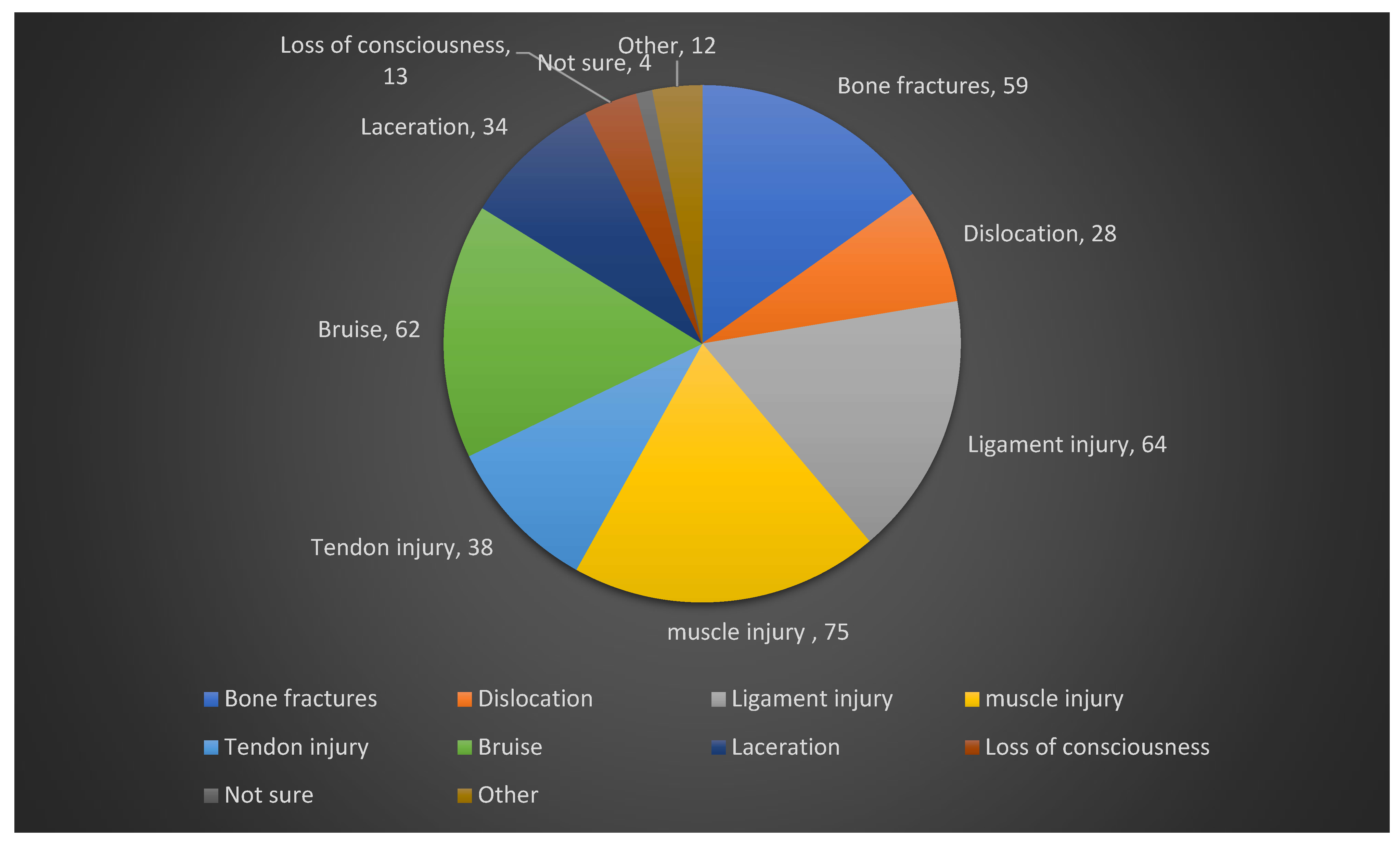 26]. In contrast, contusions were the third most frequently reported injury type in this study. This differs from previous studies [