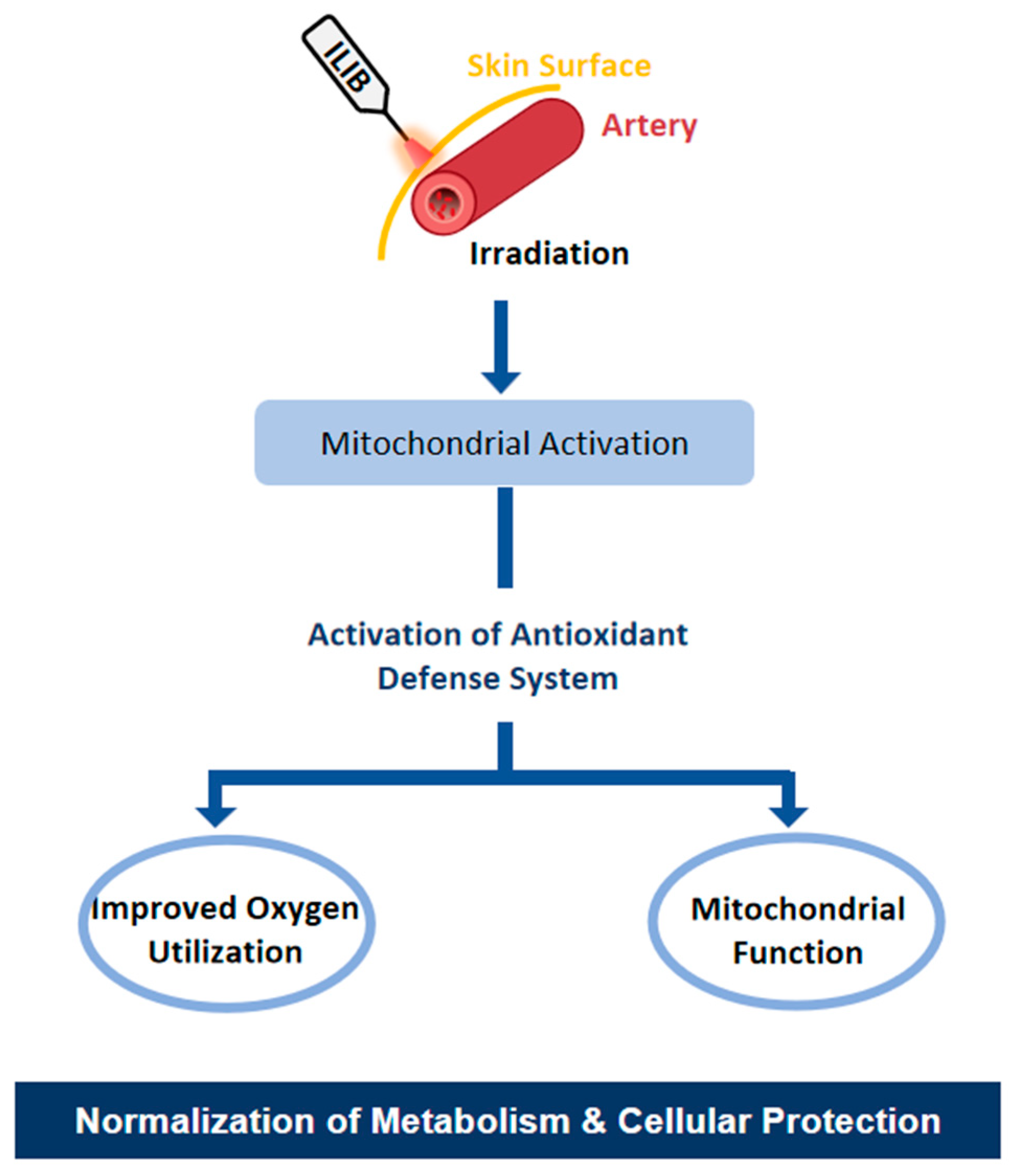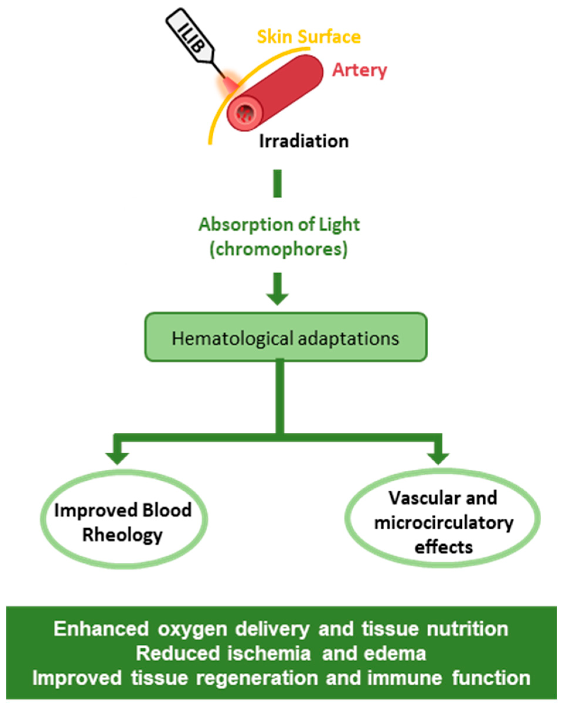 - Díaz, L.; Gil, A.C.; Von Marttens, A.; Basualdo, J.; Sotomayor, C.; Becerra, A.V.; Beltrán, V.; Jorquera, G.; Caviedes, R.; Fernández, E. The clinical efficacy of intravascular laser irradiation of blood (ILIB): A narrative review of randomized controlled trial. Photodiagnosis Photodyn. Ther. 2025, 53, 104618. [Google Scholar] [CrossRef]