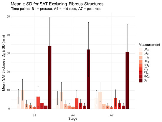 The distribution of SAT excluding embedded fibrous structures at prerace, mid-race (after Stage 4), and post-race (after Stage 7) is shown in Figure 1. After Stage 4, significant absolute decreases were observed in the sum of DE (p = 0.001) and the sum of DI (p = 0.006), as well as at specific sites: UAE (p = 0.035), LAE (p = 0.001), LTE (p = 0.026), LTI (p = 0.028), and LAI (p = 0.002). Following Stage 7, further significant reductions were found in total DE (p < 0.001) and DI (p = 0.001), and at individual sites: LAE (p = 0.001), LTE (p = 0.014), FTE (p = 0.025), LAI (p = 0.004), LTI (p = 0.011), and FTI (p = 0.041).